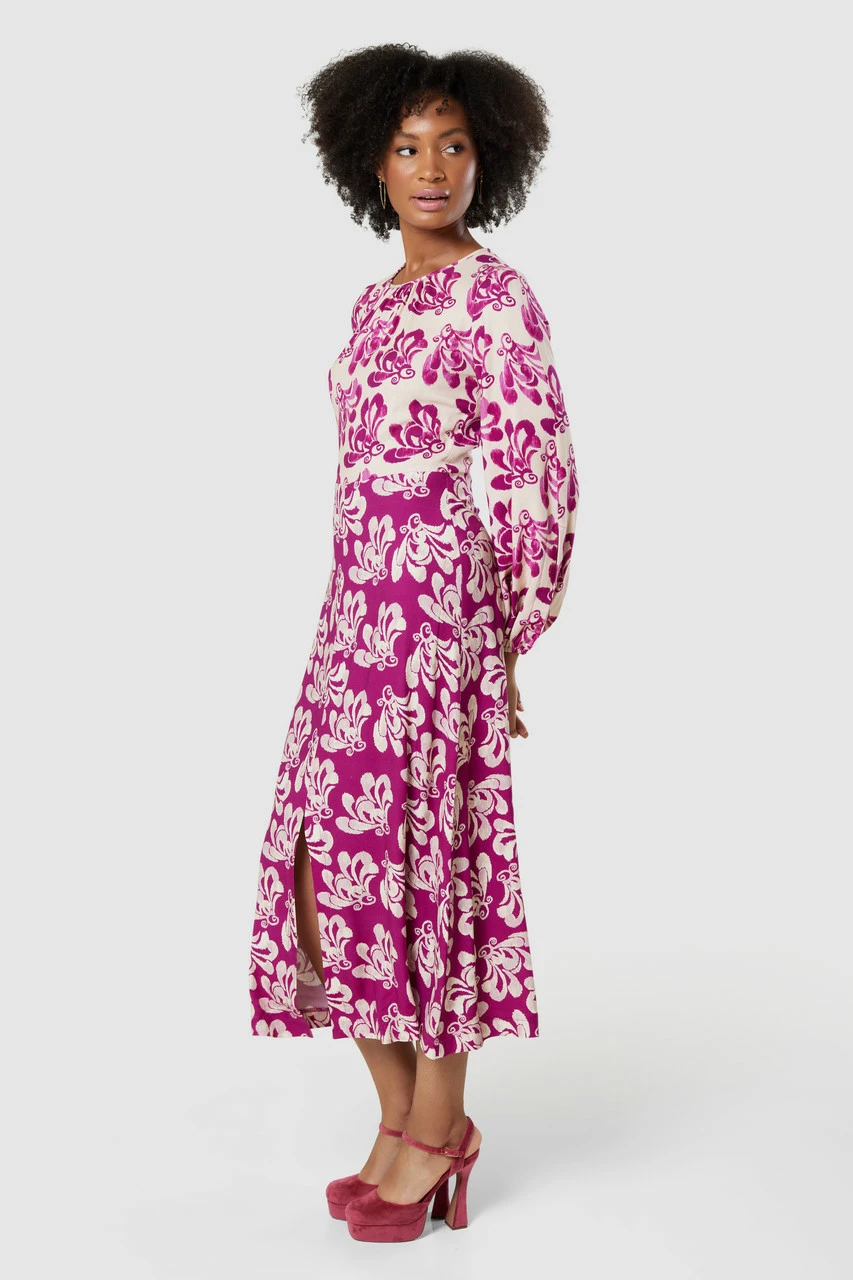 Details: Puff sleeves, Gathers on shoulders, A- line silhouette, Front cut split, Elasticated cuffs