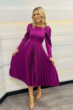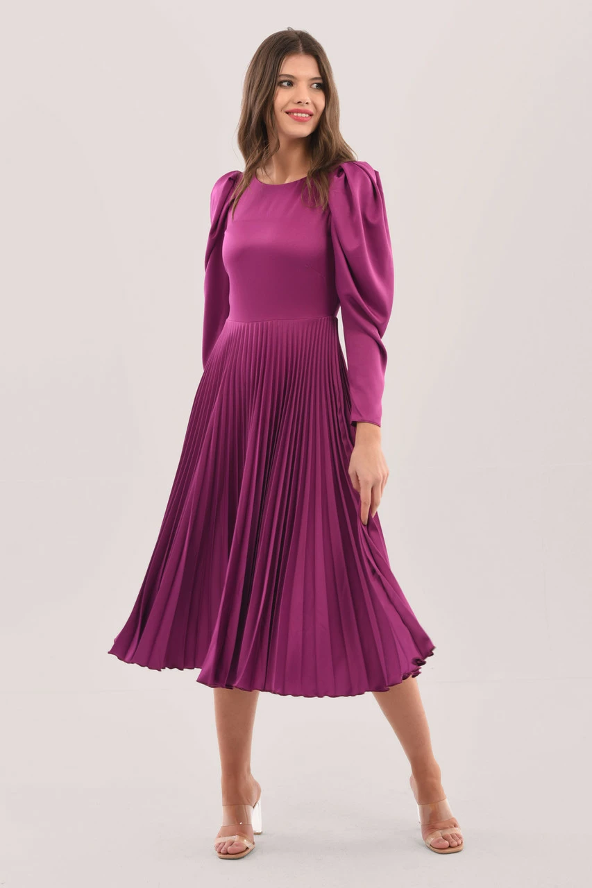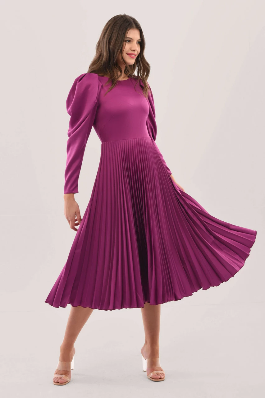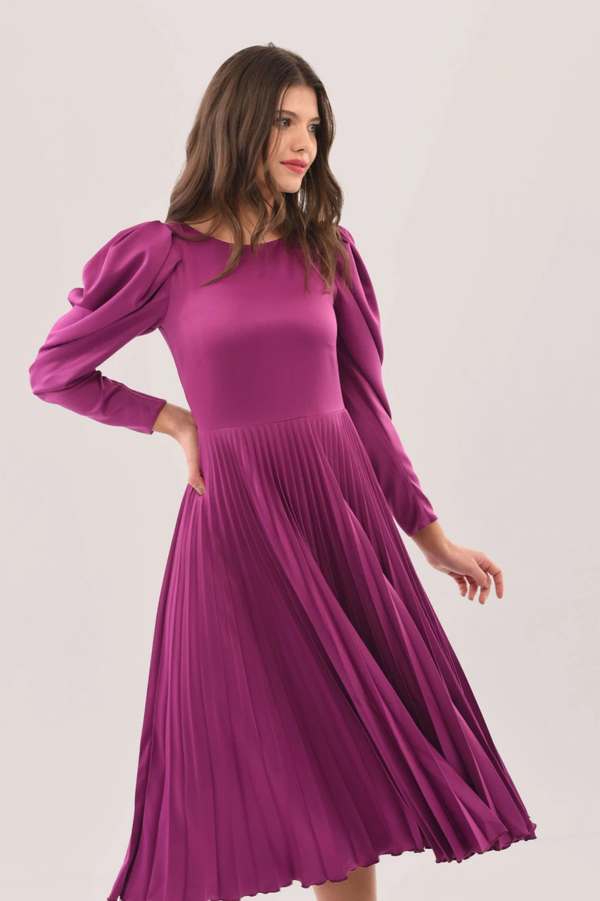 Our bestselling pleated midi dress with generous leg-of-mutton sleeves in an Magenta soft satin.