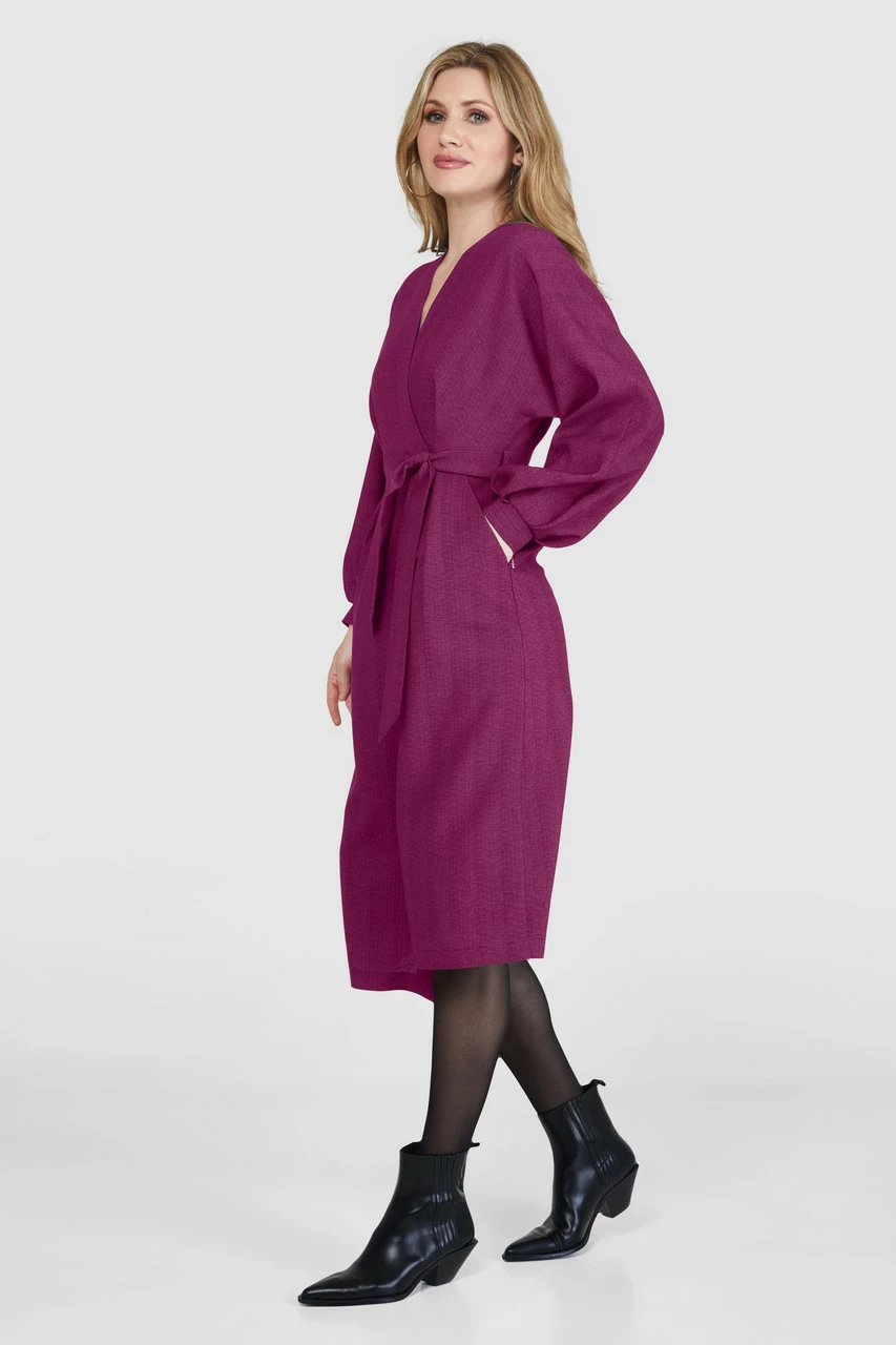 A Striped magenta wrap dress with a dropped armhole and puff sleeve. High/low hem and tie belt.