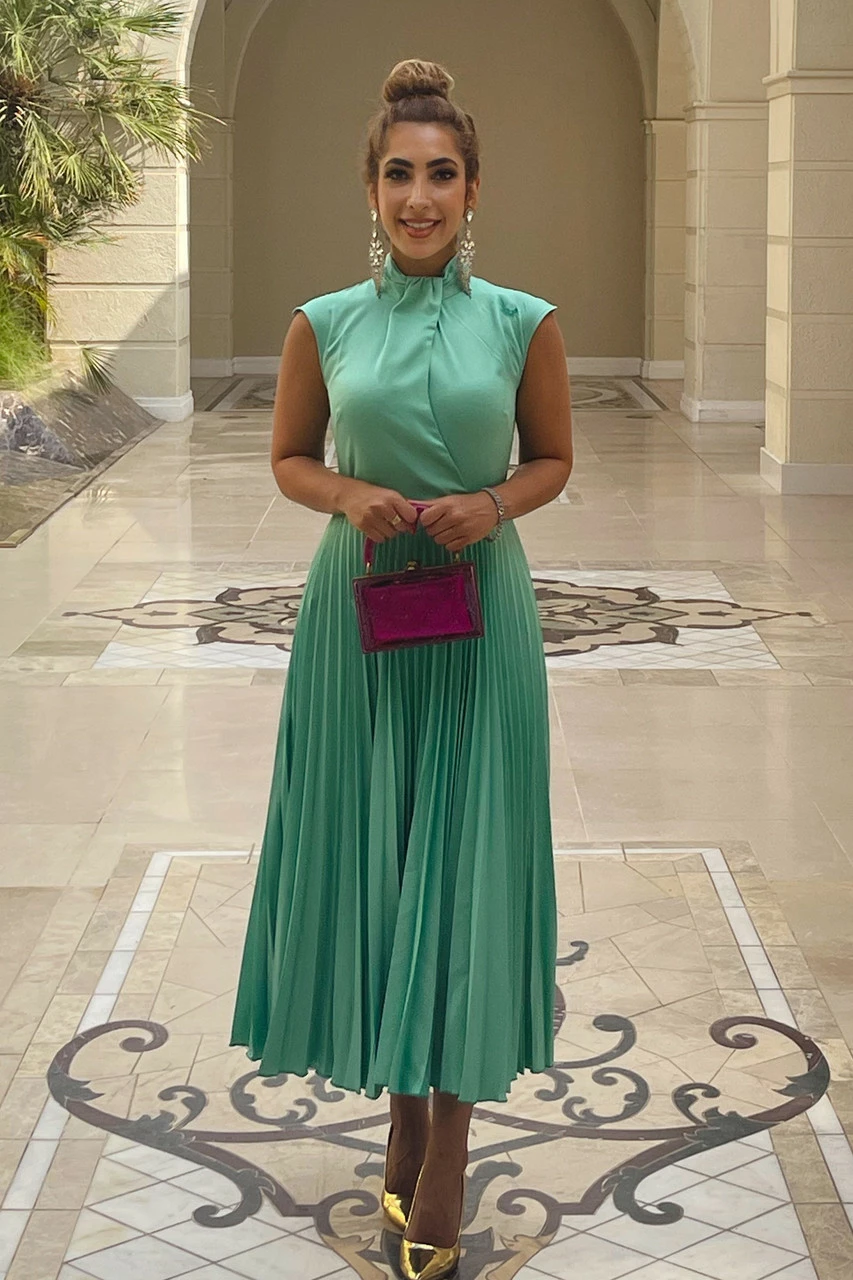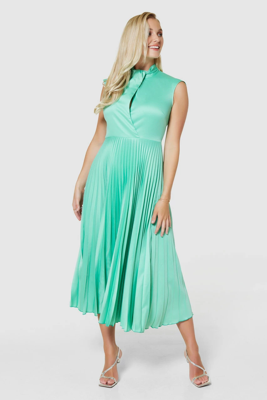 A matt mint satin dress with a subtle keyhole opening at the waist, a draped collar and long sunray pleated skirt