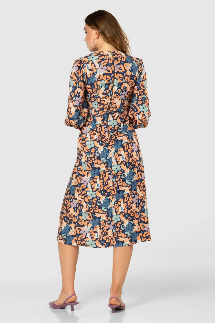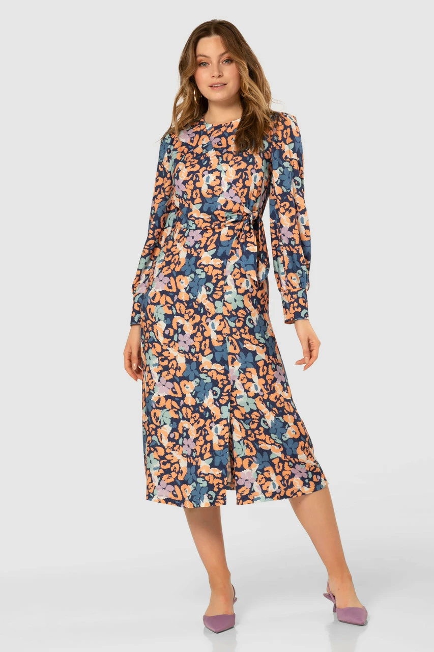 An elegant A-Line Dress with a side split and draped wrap detail in a floral, animal print.