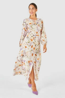 Style: Floral Print Gathered Neck Midi Dress