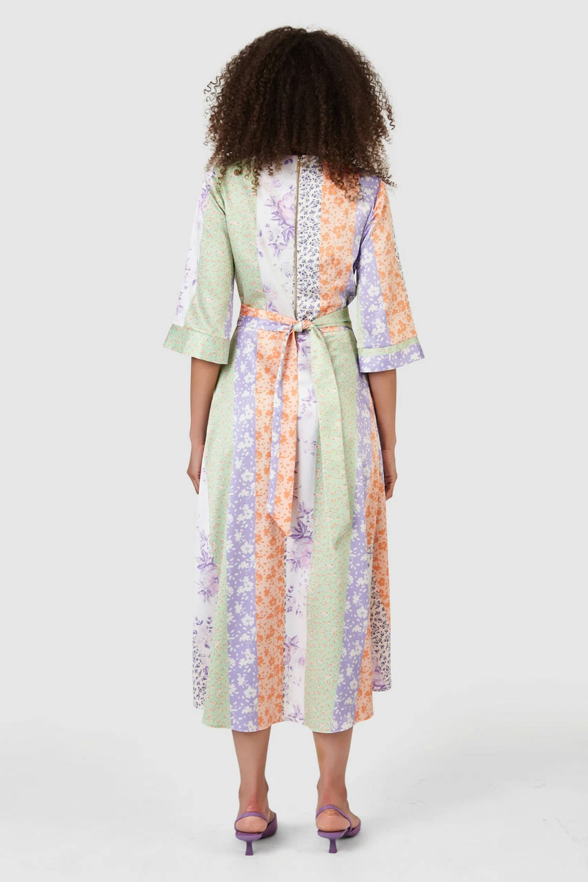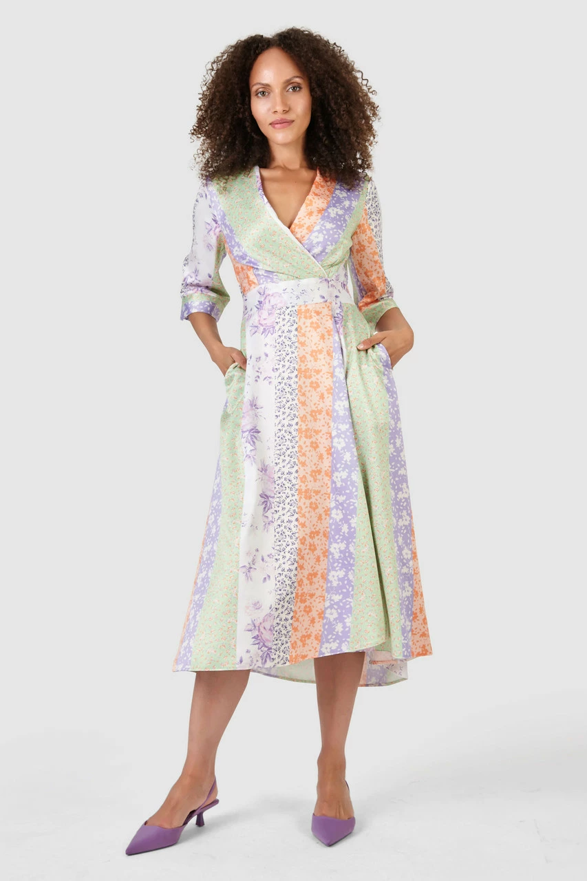 Our best-selling wrap Dress in a ditsy stripe printed matt satin.