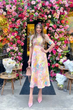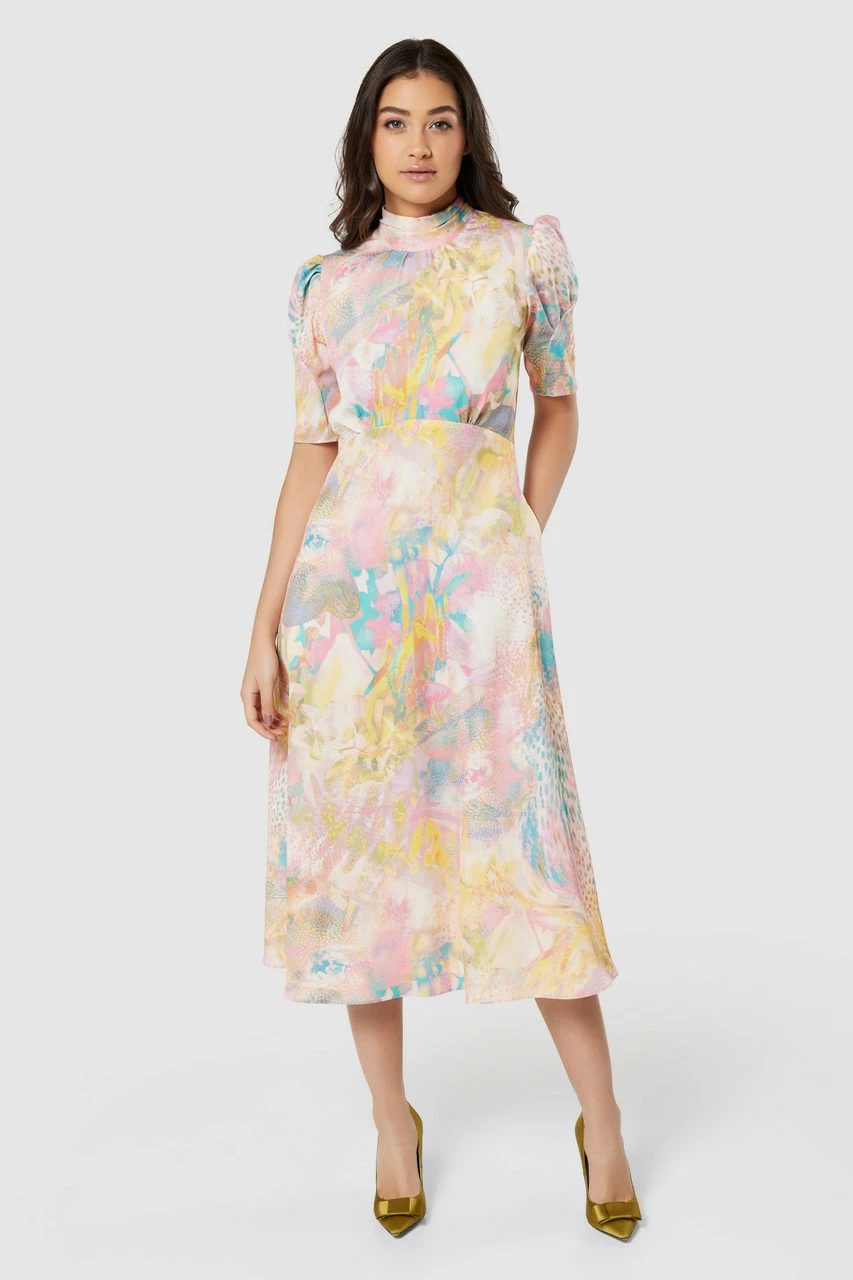 Our bestselling high-neck midi dress with neck tie in a swirling marble print