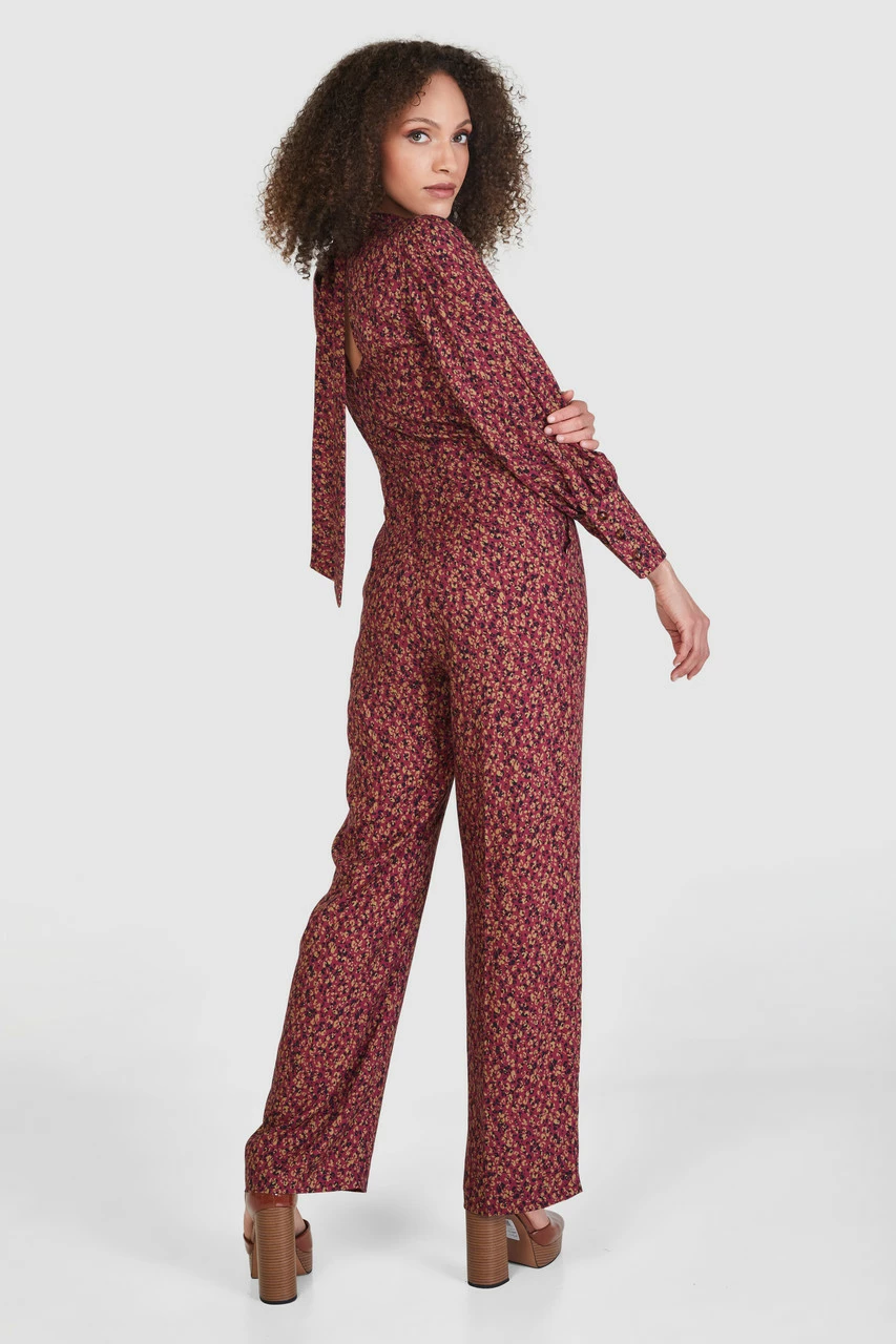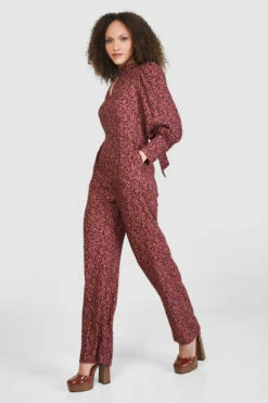 A maroon animal printed Viscose Jumpsuit with a straight leg, high neck and puff sleeves with a deep cuff.