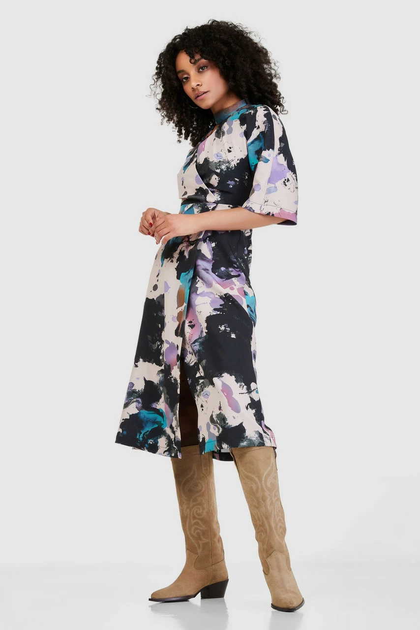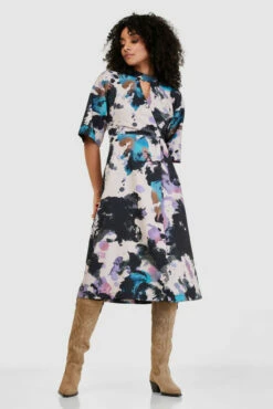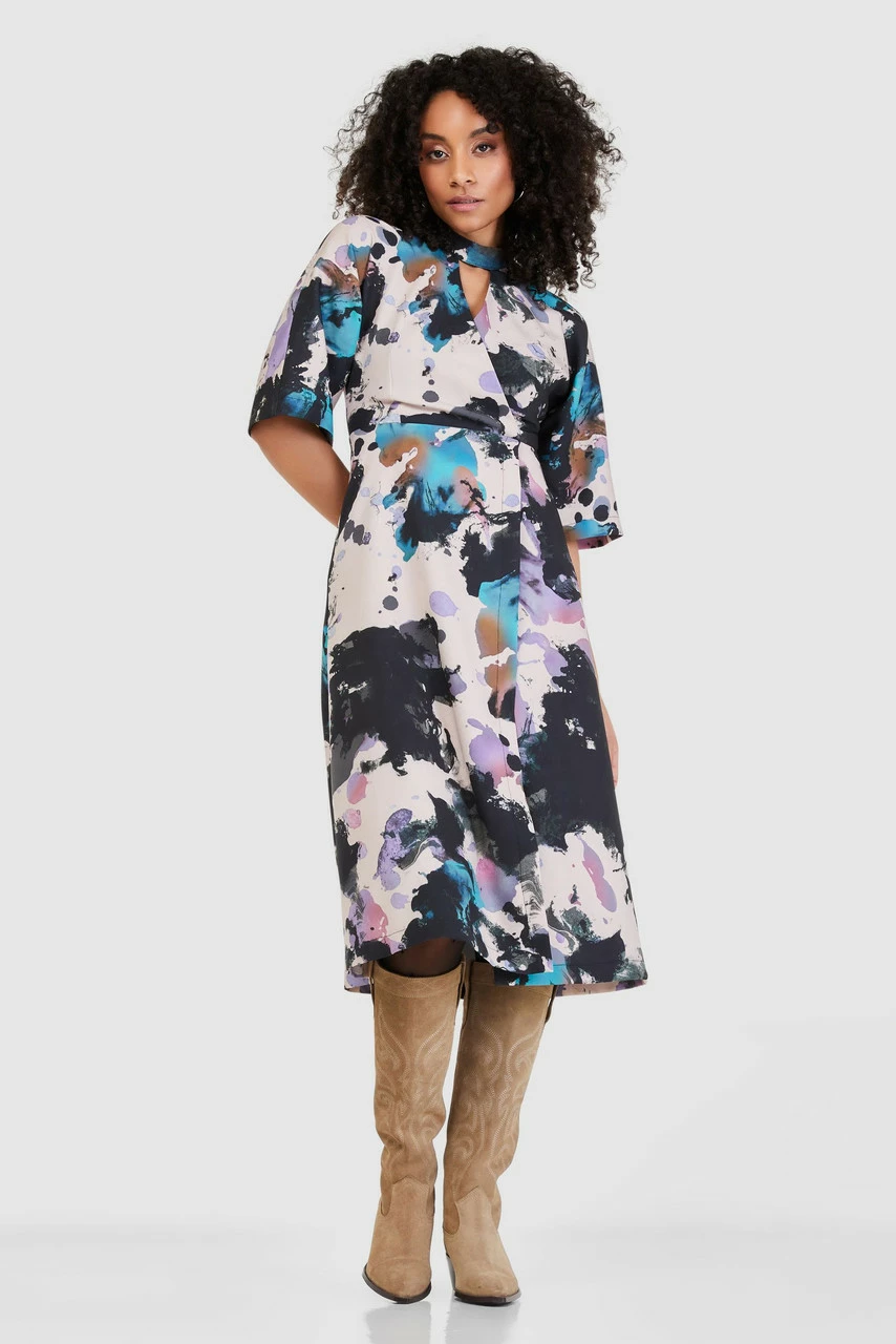 The lavender and teal splodges of this print make this Kimono wrap Dress rather striking with it’s high collar and keyhole opening.