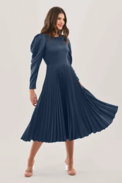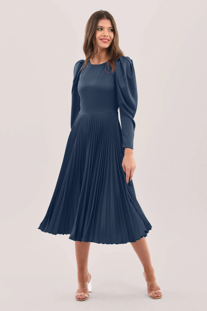 Our bestselling pleated midi dress with generous leg-of-mutton sleeves in navy matt satin.