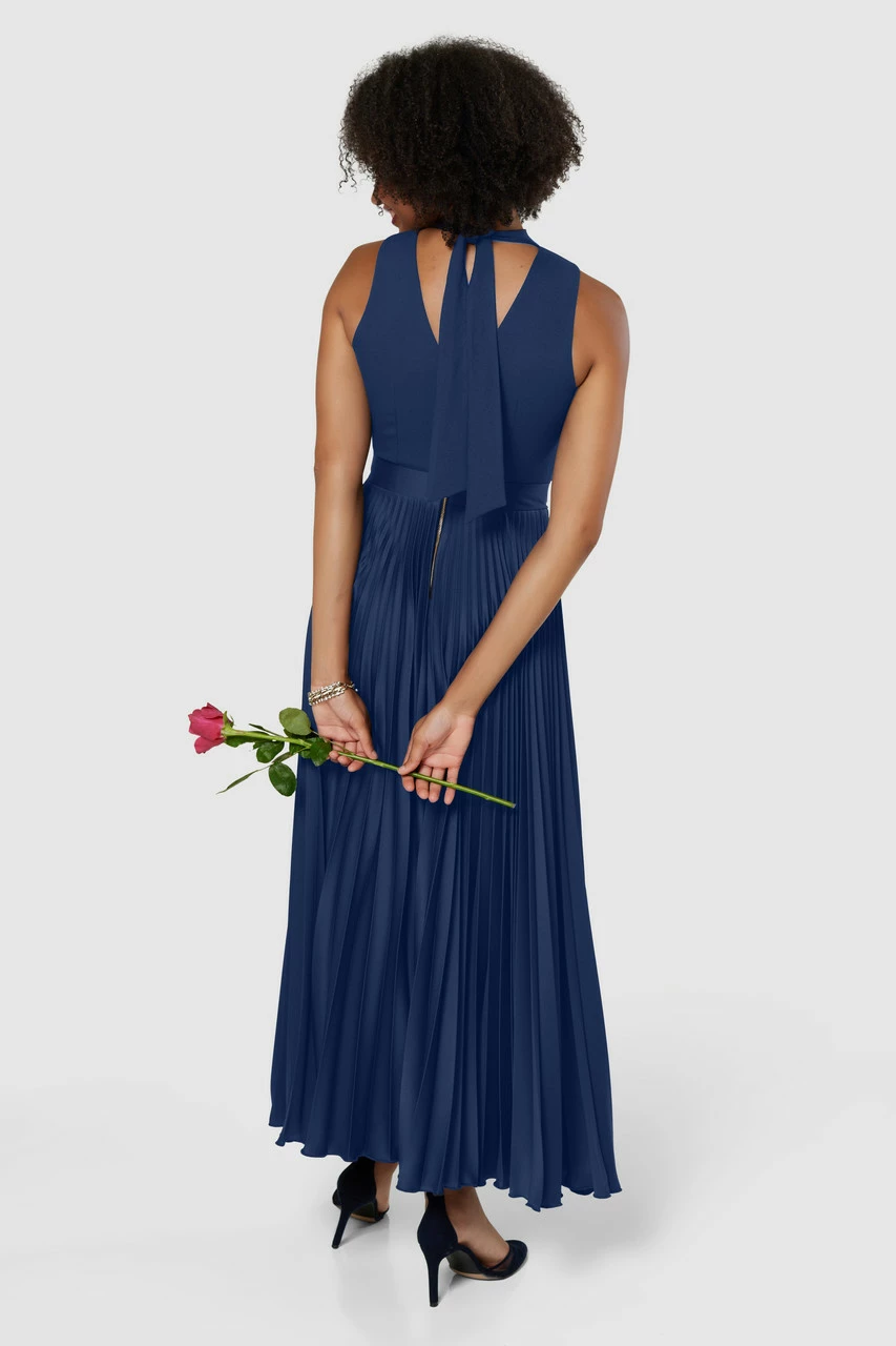 Make a statement with our Midaxi Length Bridesmaid Dress. The luxurious crepe fabric, halter neck, and wrap tie neck create an elegant and sophisticated look. The pleated skirt and drape detail complete the silhouette, and the navy colour is timeless. Perfect for any special occasion, this dress exudes confidence and beauty.