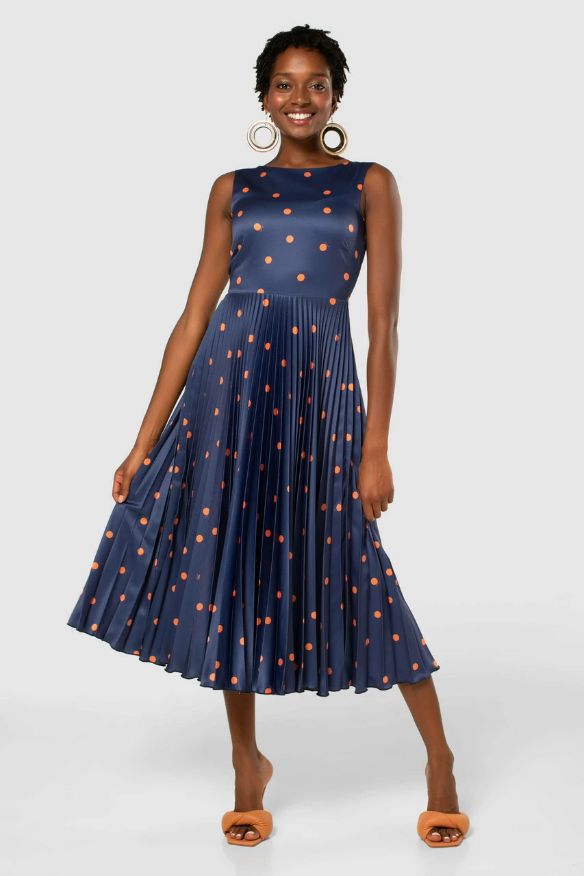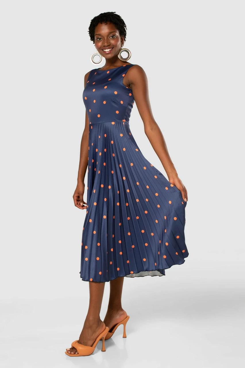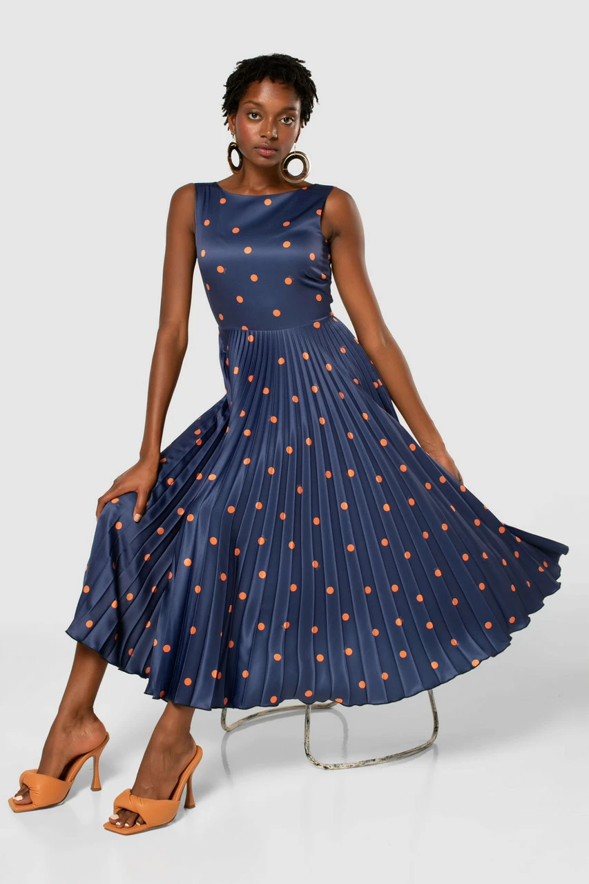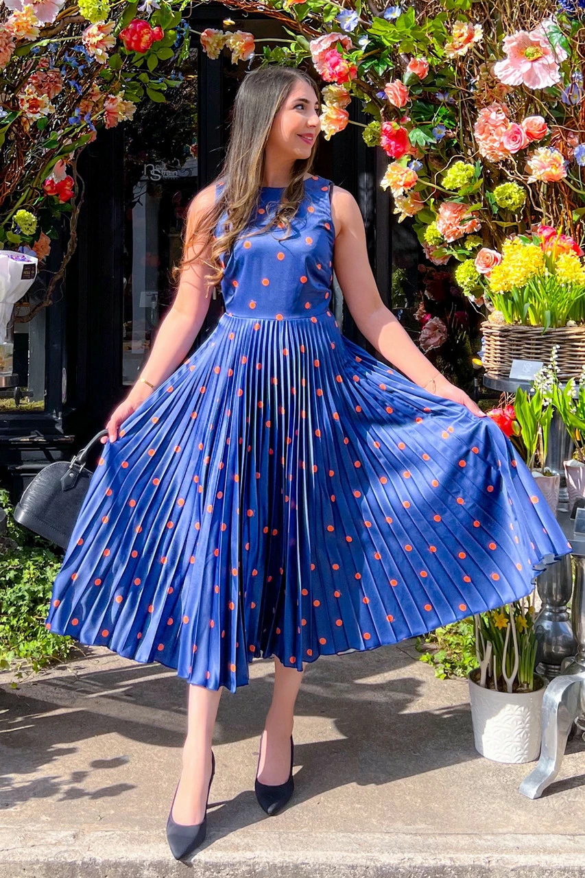 A classic navy skater Dress with a sunray pleated skirt and unexpected orange spots that is reminiscent of “Pretty Woman”