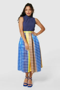 This Closet Gold 2-in-1 dress is always a winner, possibly because the fitted top suits everyone and the volume on the skirt hides a multitude of sins. The top is beautiful dark blue, and the skirt is in a fun striped spot-printed satin. And it has pockets!