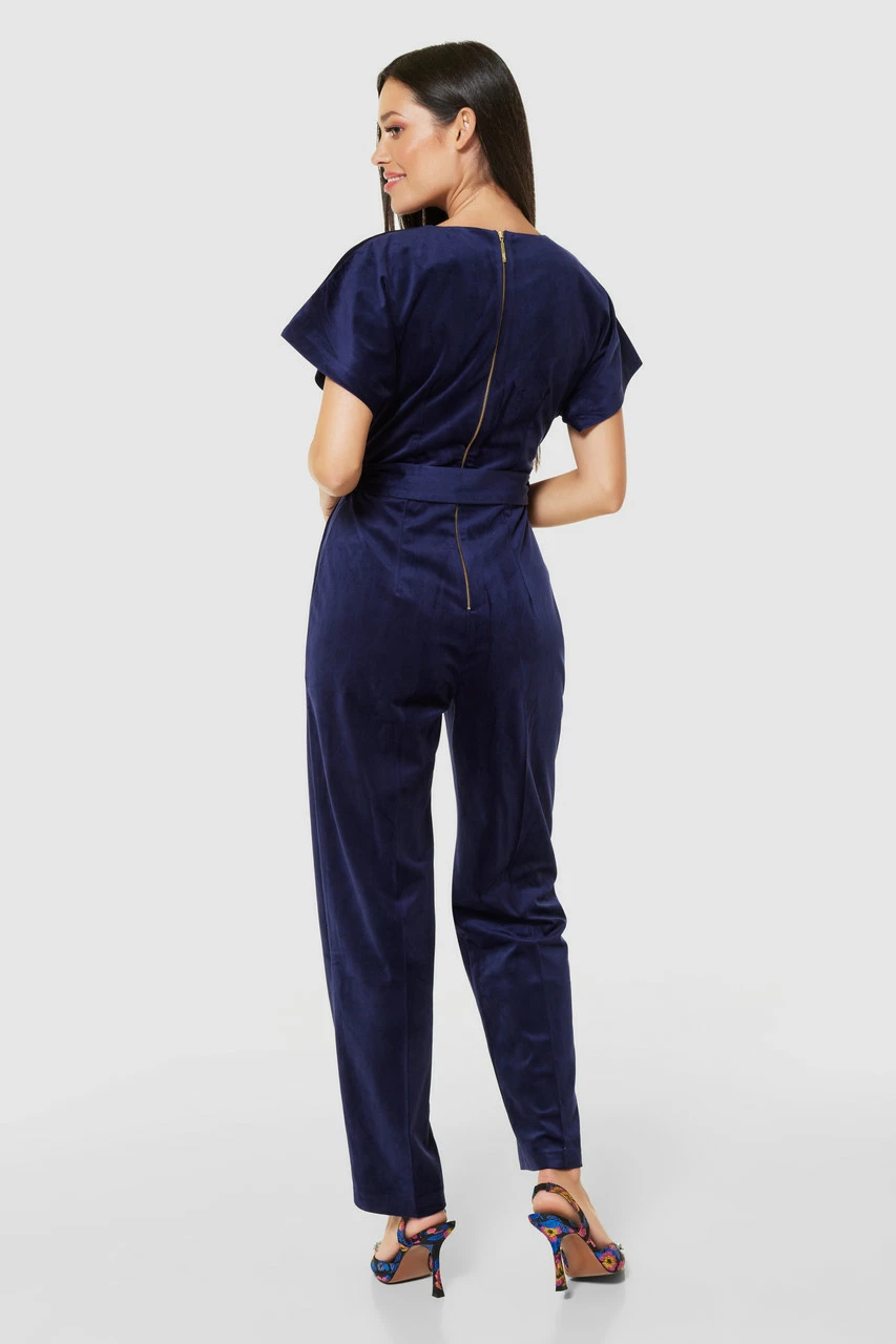 A navy velvet Jumpsuit with a wrap front, Kimono sleeve and tie belt.