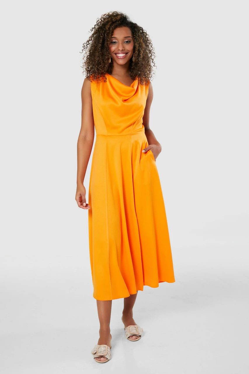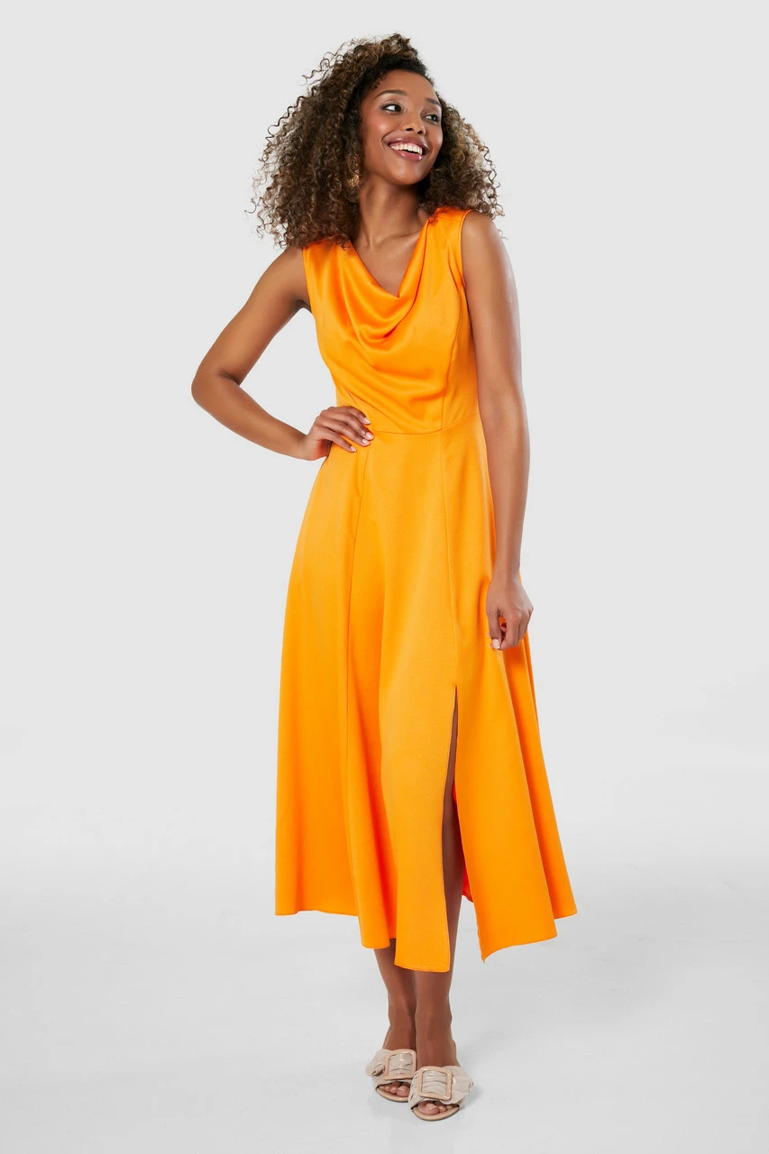 An elegant sleeveless Satin skater Dress with a cowl neck and split front skirt.