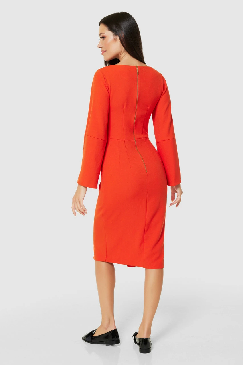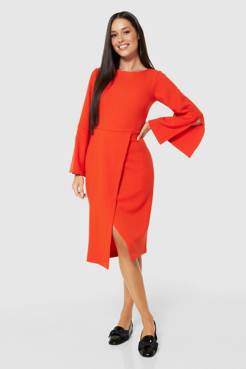 This Orange flared sleeve pencil midi dress has a split skirt design and features flared sleeves and Round neckline. This elegant dress is perfect for any occasion, from weddings, cocktail parties to work. Pair with some heels or wedges for the perfect night out ensemble.