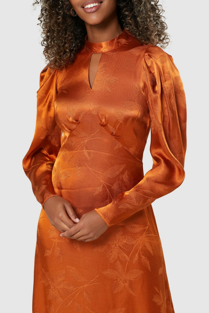 A pleated puff sleeve Dress with a keyhole opening and narrow collar in a matt Jacquard.