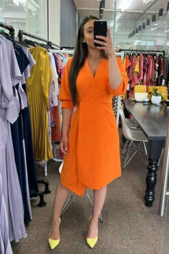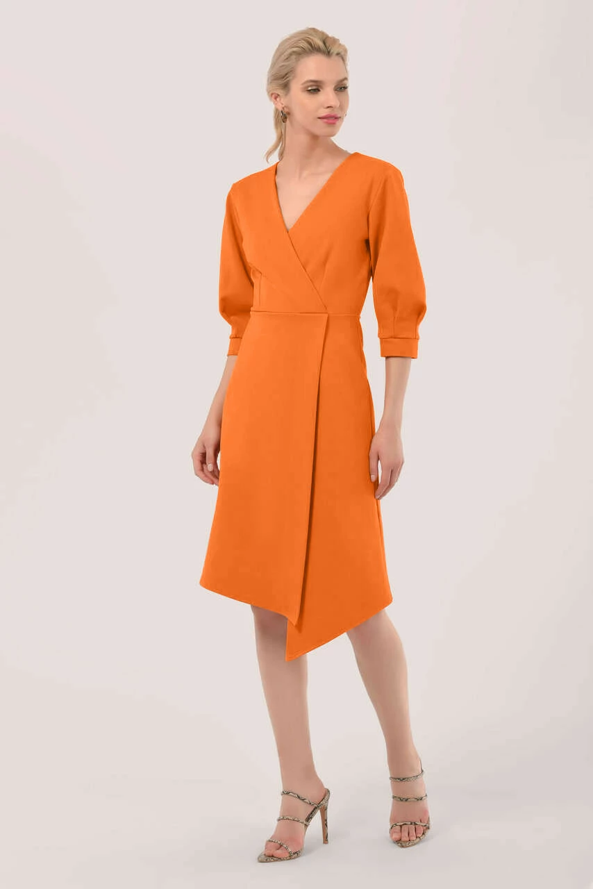 Details: Wrap dress, pleats detail, Overlapping panels, A- line silhouette, Fitted bodice, Puff sleeves, Midi