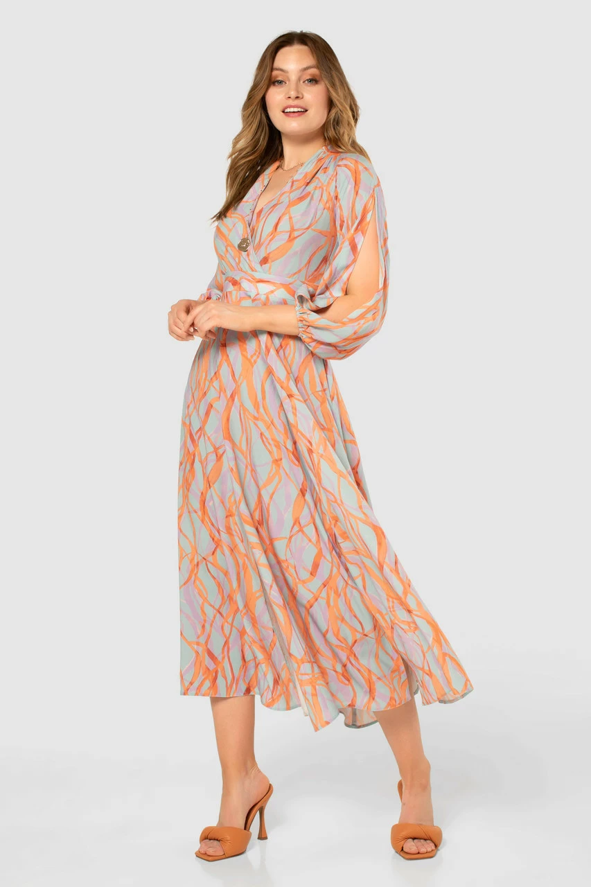 Our bestselling wrap Dress with a full panelled skirt, two front splits in a striking Viscose print.