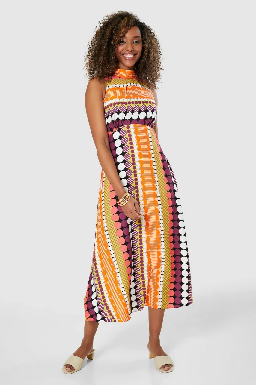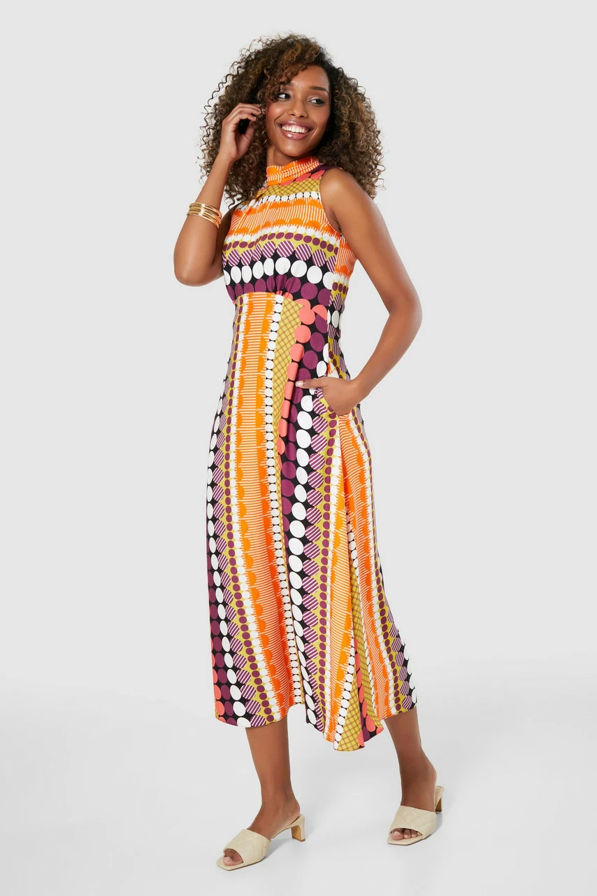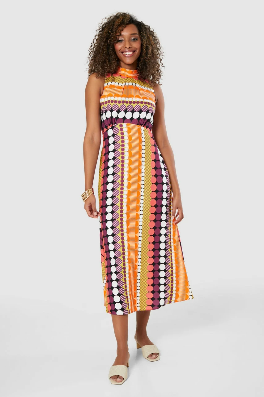 We have removed the sleeves on our bestselling high neck Dress and cut it in a bold striped spot print to create an effortless summer dress.