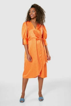A high/low wrap Dress in a vibrant Orange printed with tiny contrasting Mauve diamonds.