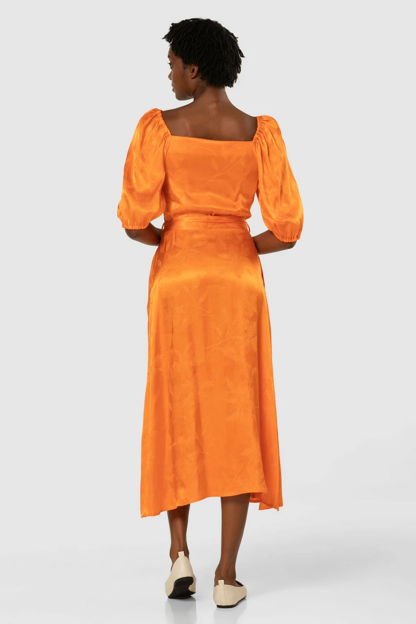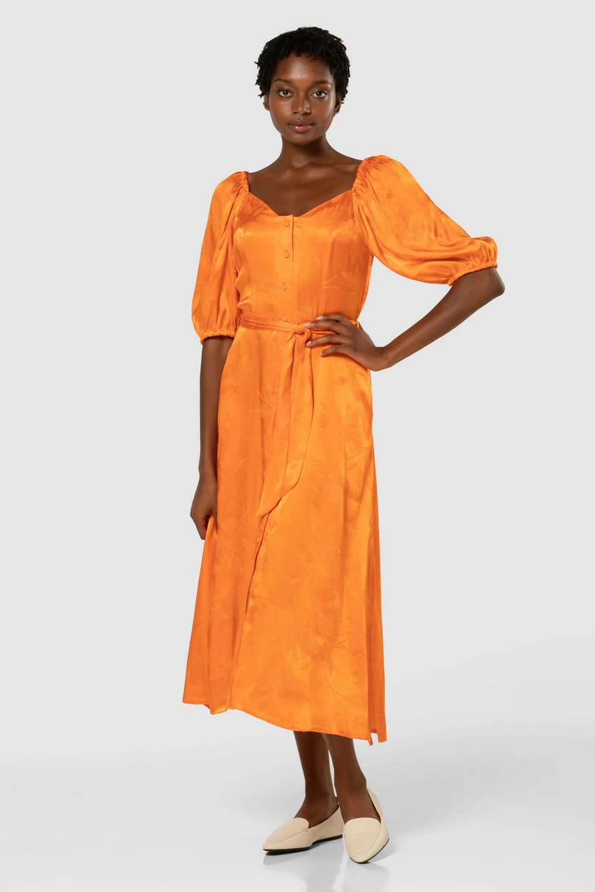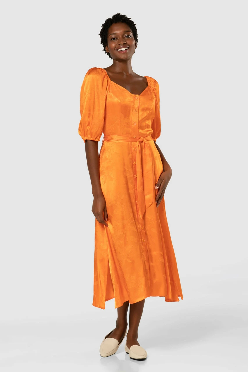 A beautiful orange satin Jacquard Dress with a flattering sweetheart neckline, tie belt and pockets, that buttons up the front.