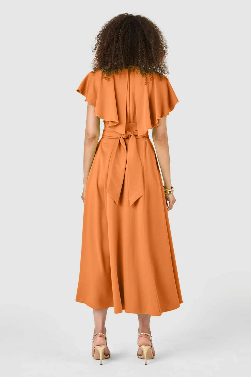 Details: Tie back waist, Side pockets, Front cut slit, Frill sleeves, A – line silhouette