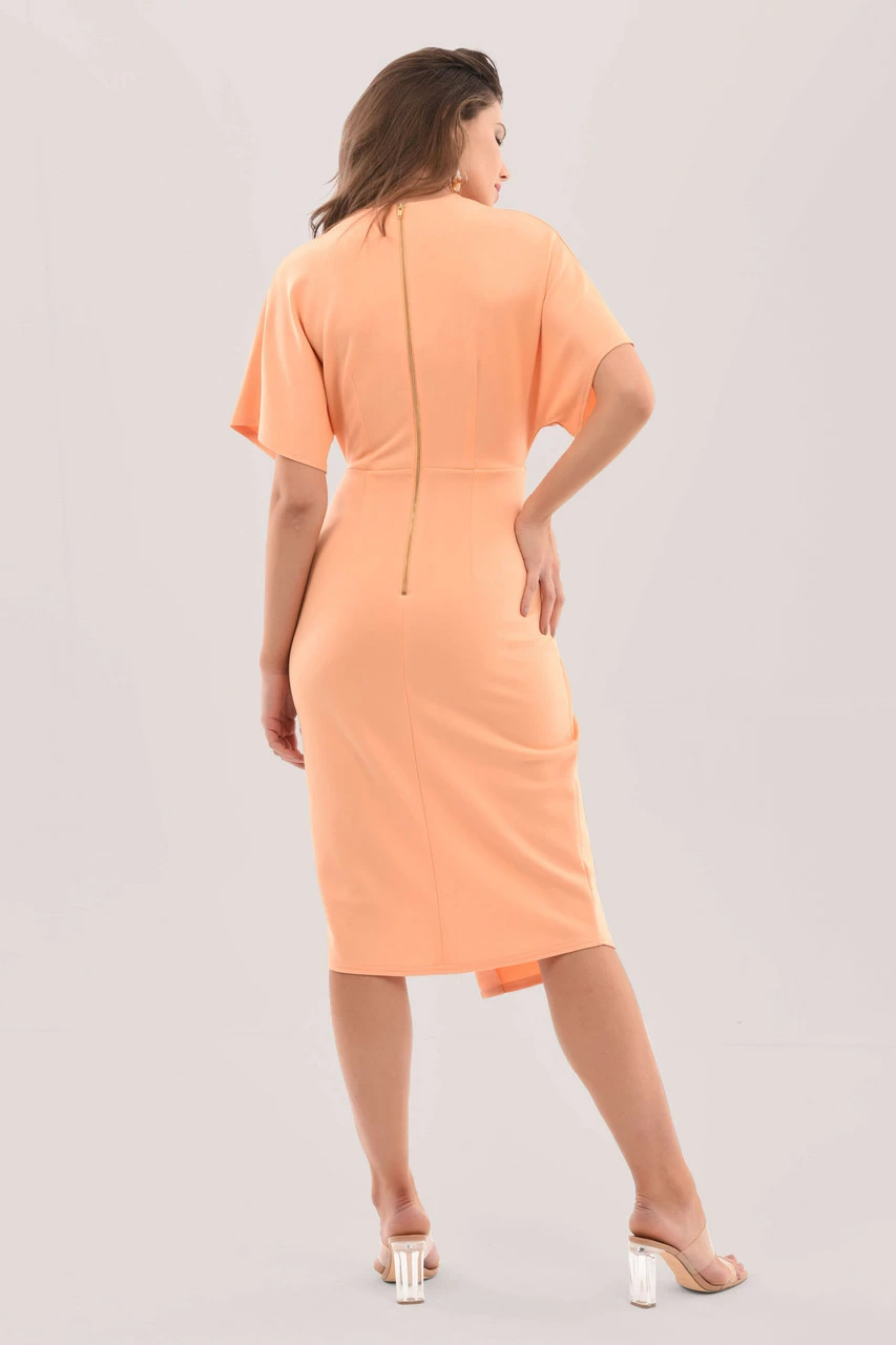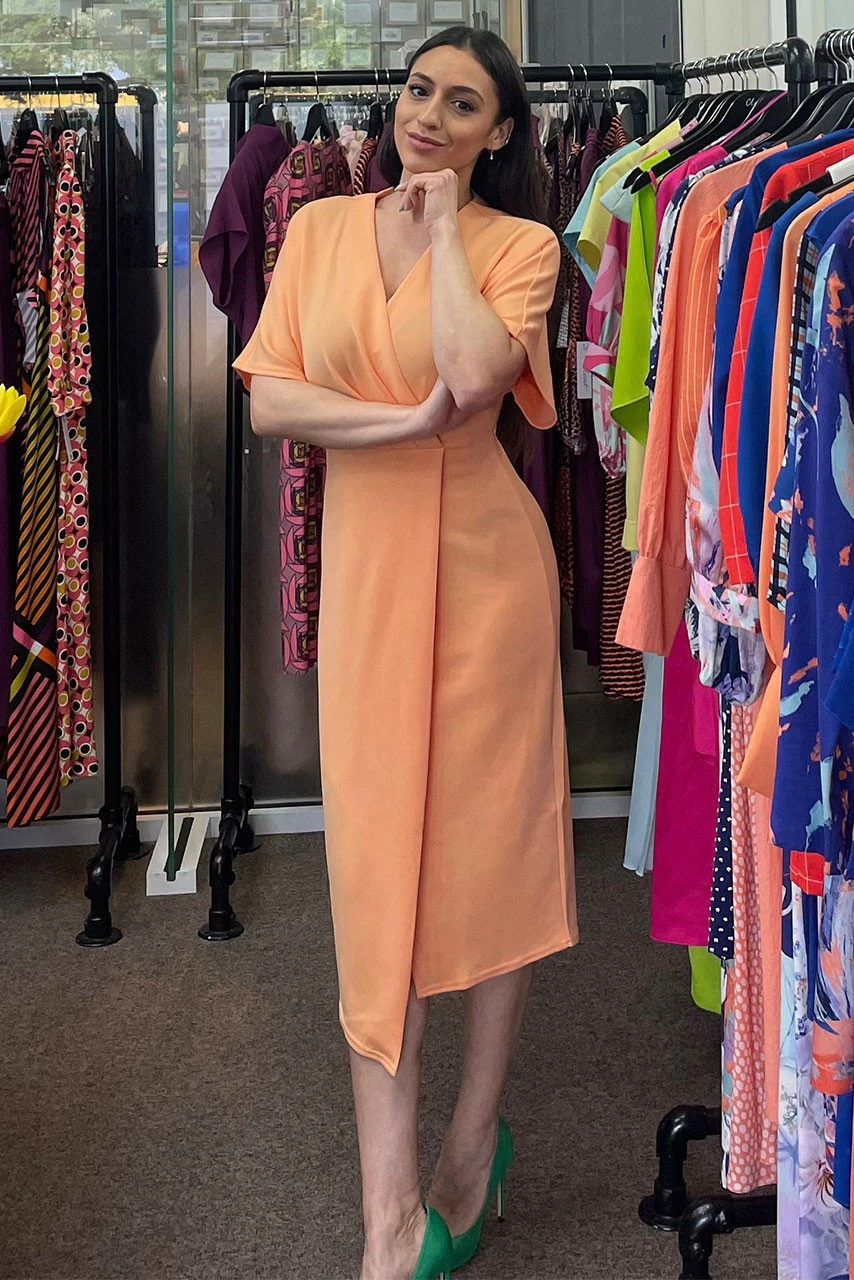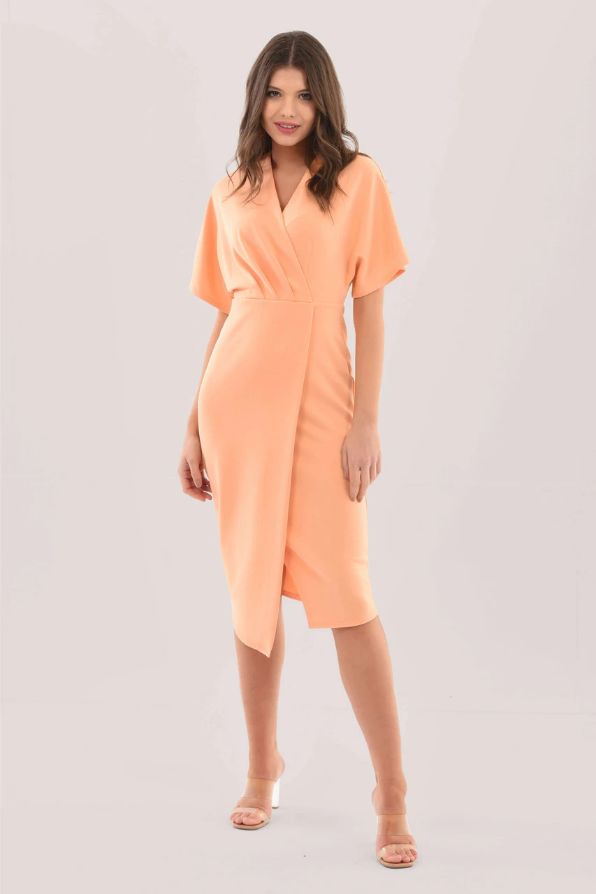 Details: Midi, Wrap front, Kimono sleeves, Front cut slip, Subtle pleats