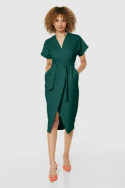 Details: Tie waist front, Side pockets, Wide sleeves, Wrap front, Cut slit front, Tulip style skirt, Kimono sleeves, Midi dress, Kimono sleeves