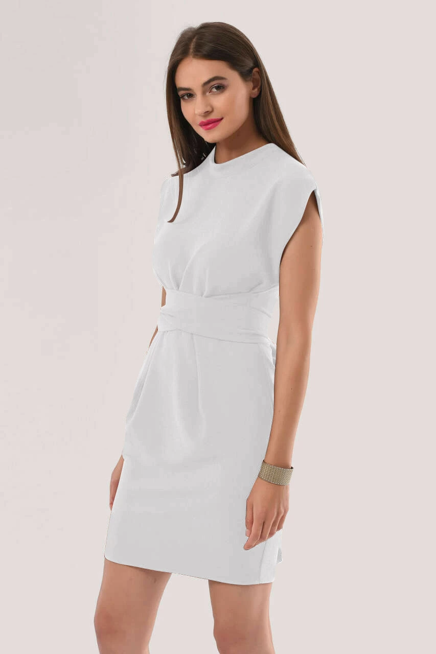 Details: Tie back waist, keyhole details, Cap sleeves, High collar, Mini dress, Wrap waist details