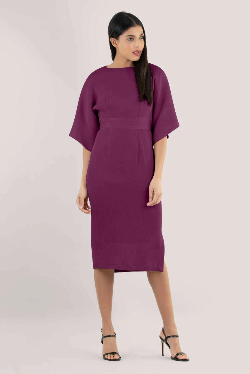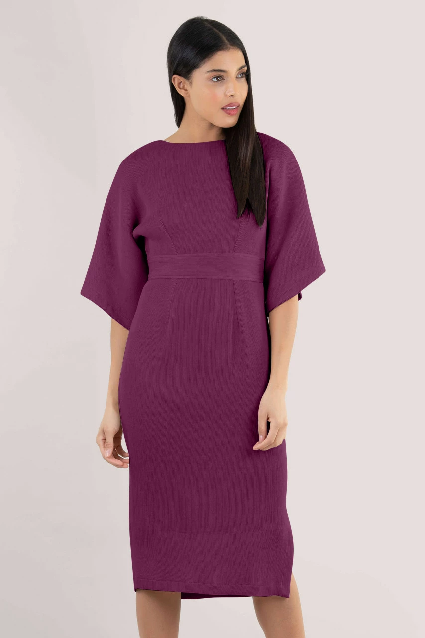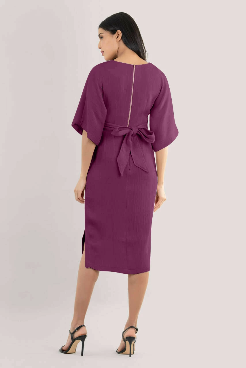 Details: Unlined, Kimono sleeves, Tie back waist, Side slit cut below, Tight waistband, Midi dress