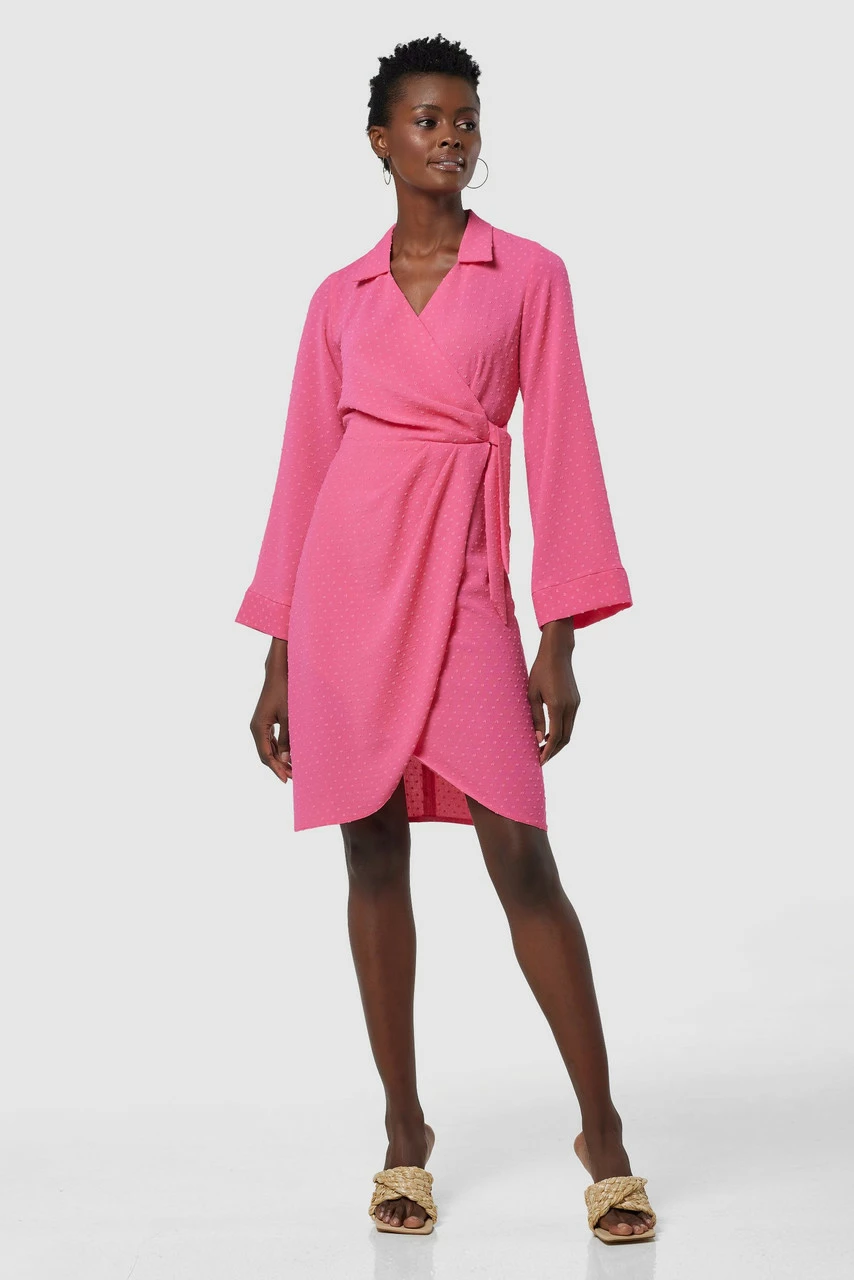 A Wrap Shirt dress in a Dobby fabric with a draped tulip skirt and tie at the side.
