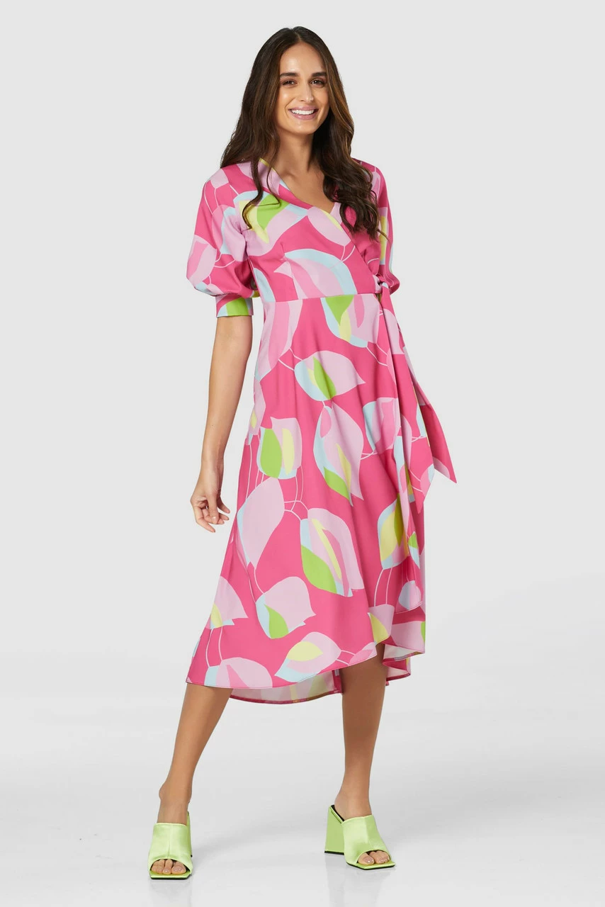 A puff sleeve wrap Dress with a subtle high/low hem that ties at the side in a printed crepe