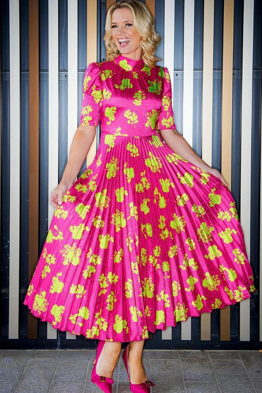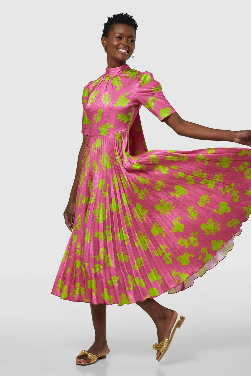 Our bestselling Dress reworked with a swishy sunray pleated skirt in a vibrant pink and lime floral printed snake Jacquard.