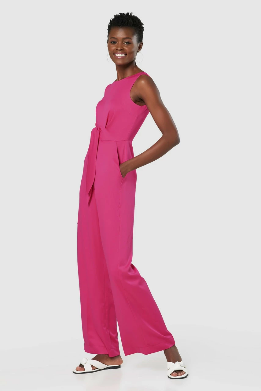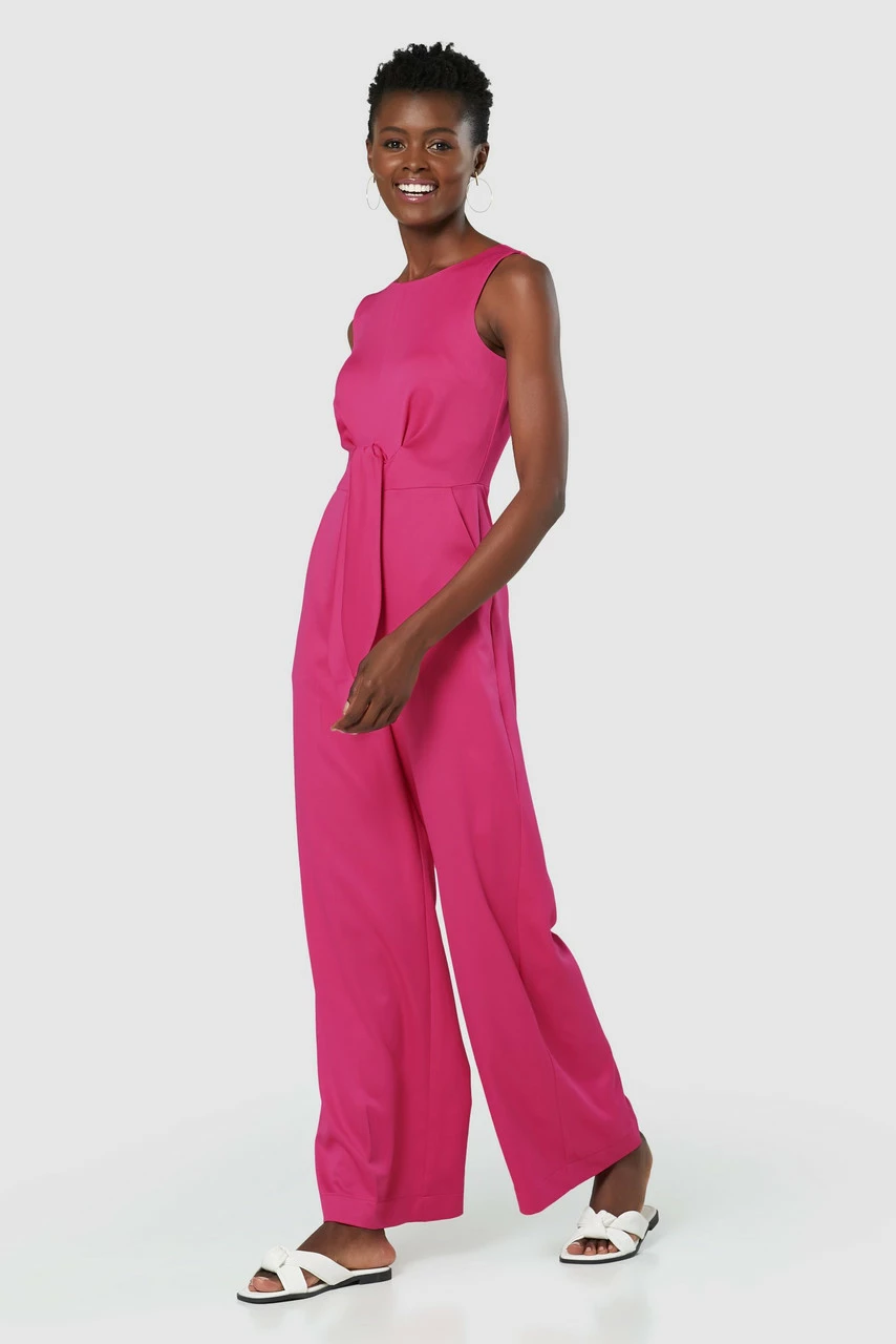 A stunning pink Jumpsuit that ties at the front waist with a v-back and wide leg