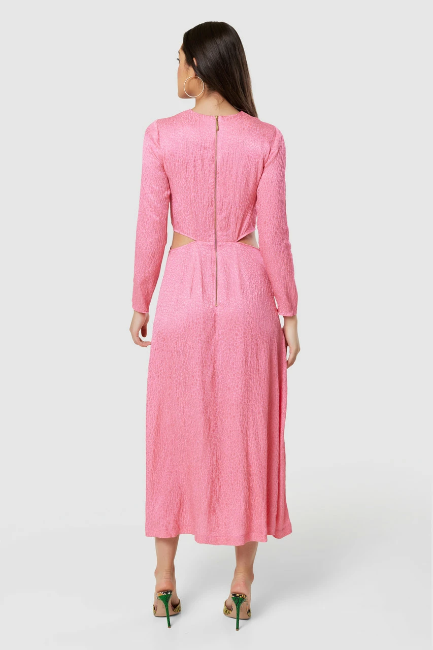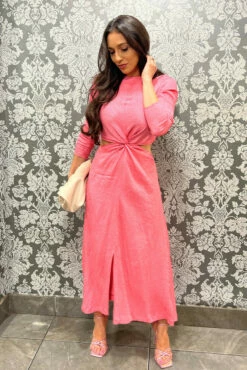An elegant a-line dress with a twist at the front waist and cutouts in a pretty jacquard with a bubble pattern in pastel pink