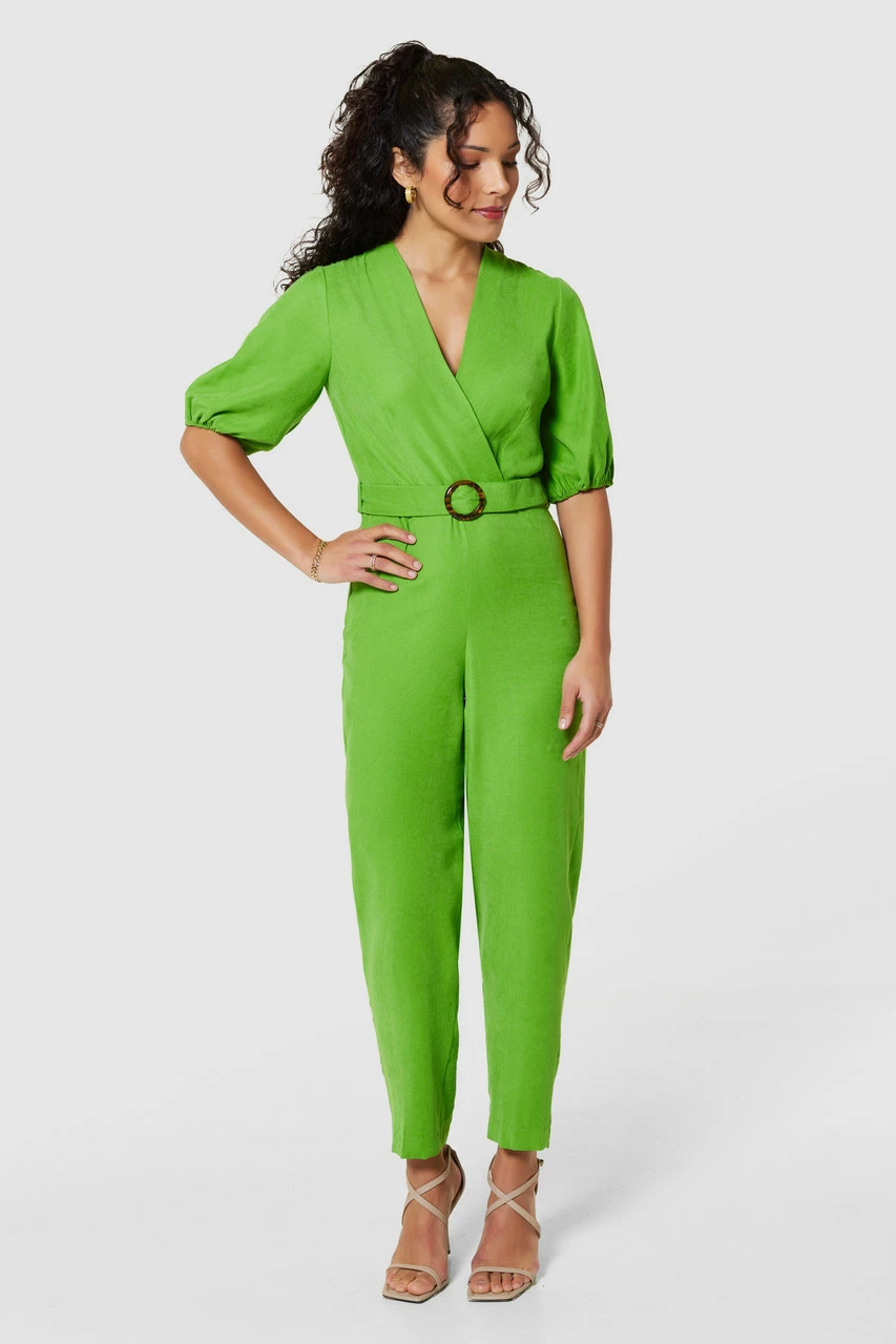 Details: Wrap front, Side pockets, Belt included, Puff sleeves, Elasticated cuffs, Straight leg