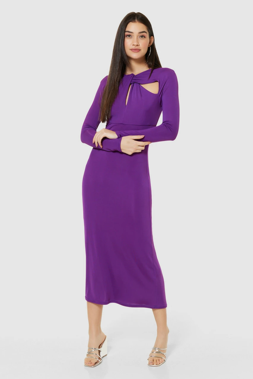 A slim-fitting midi dress in purple slinky jersey features a gorgeous twisted and cut-out neck detail, long sleeves, and is elegant. A-line skirt. We’re trying to eliminate the boring and bring fresh new pieces to revamp any dull wardrobe.