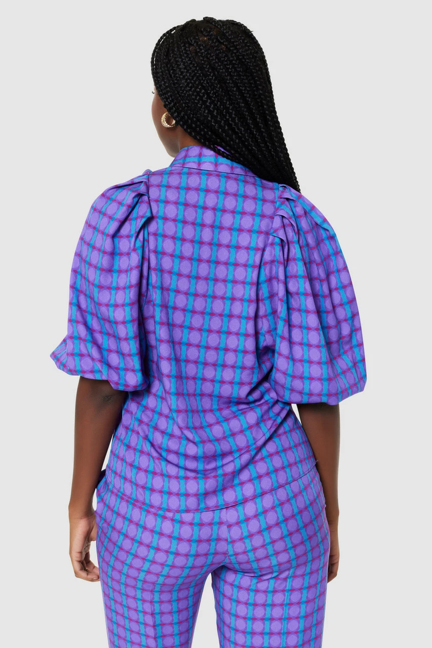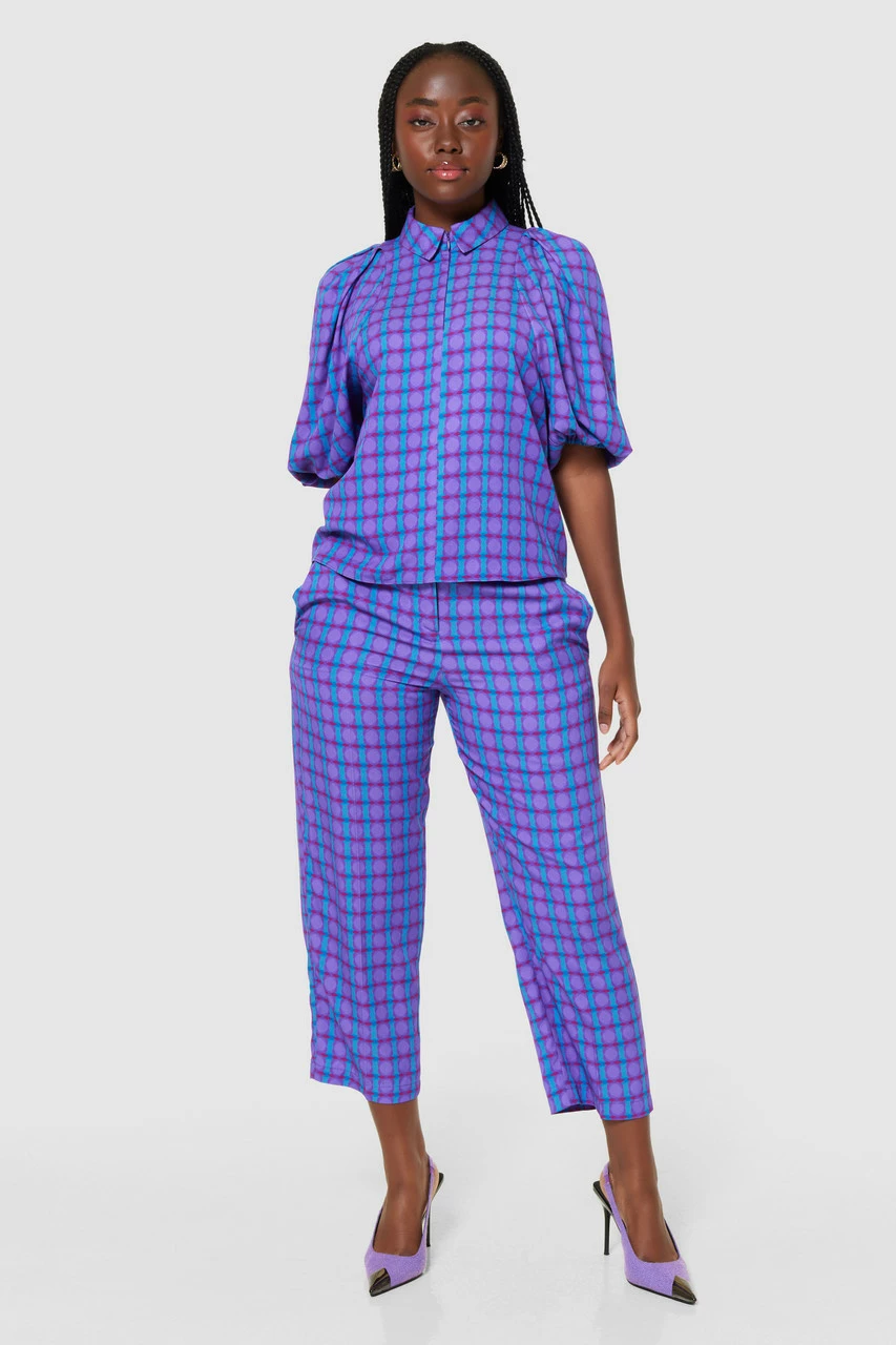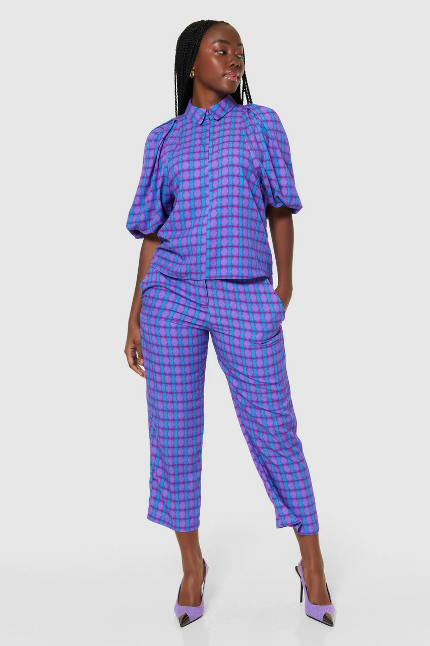 Make a fashionable statement in this zip-front blouse and matching trousers. It has soft gathers, generous puff sleeves with elasticated cuffs, and a collar with a zip up the front. The blouse is versatile enough to be dressed up or down. Although, as a co-ord it is more polished, making it a great choice for any occasion.