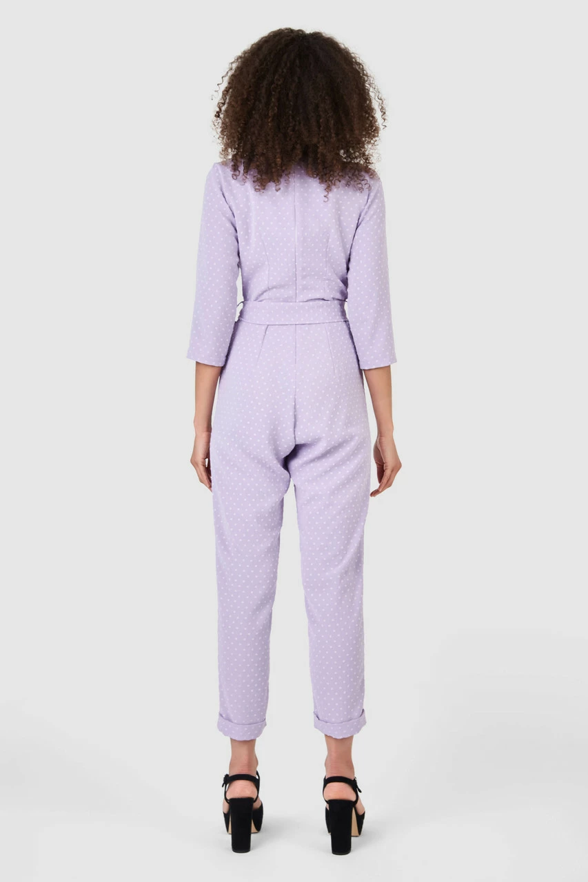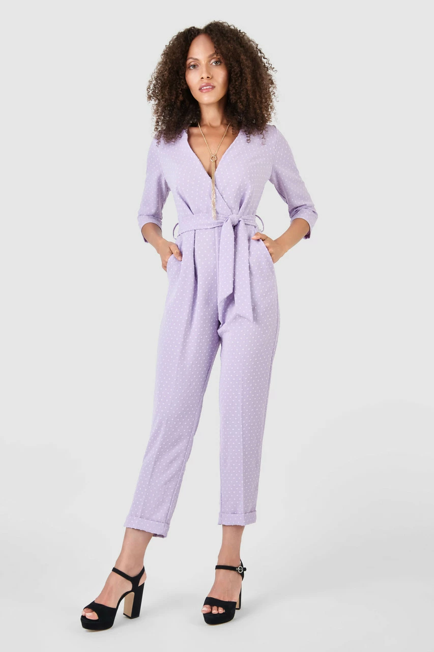 A favorite Jumpsuit cut in a dobby fabric with a tie belt and pockets.