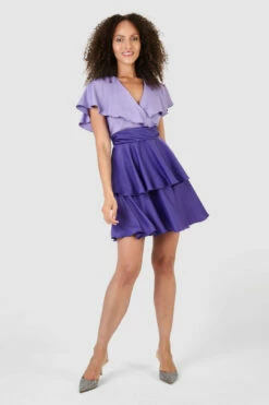 A two tone tiered frill Dress with a wrapped cape collar and tie back.