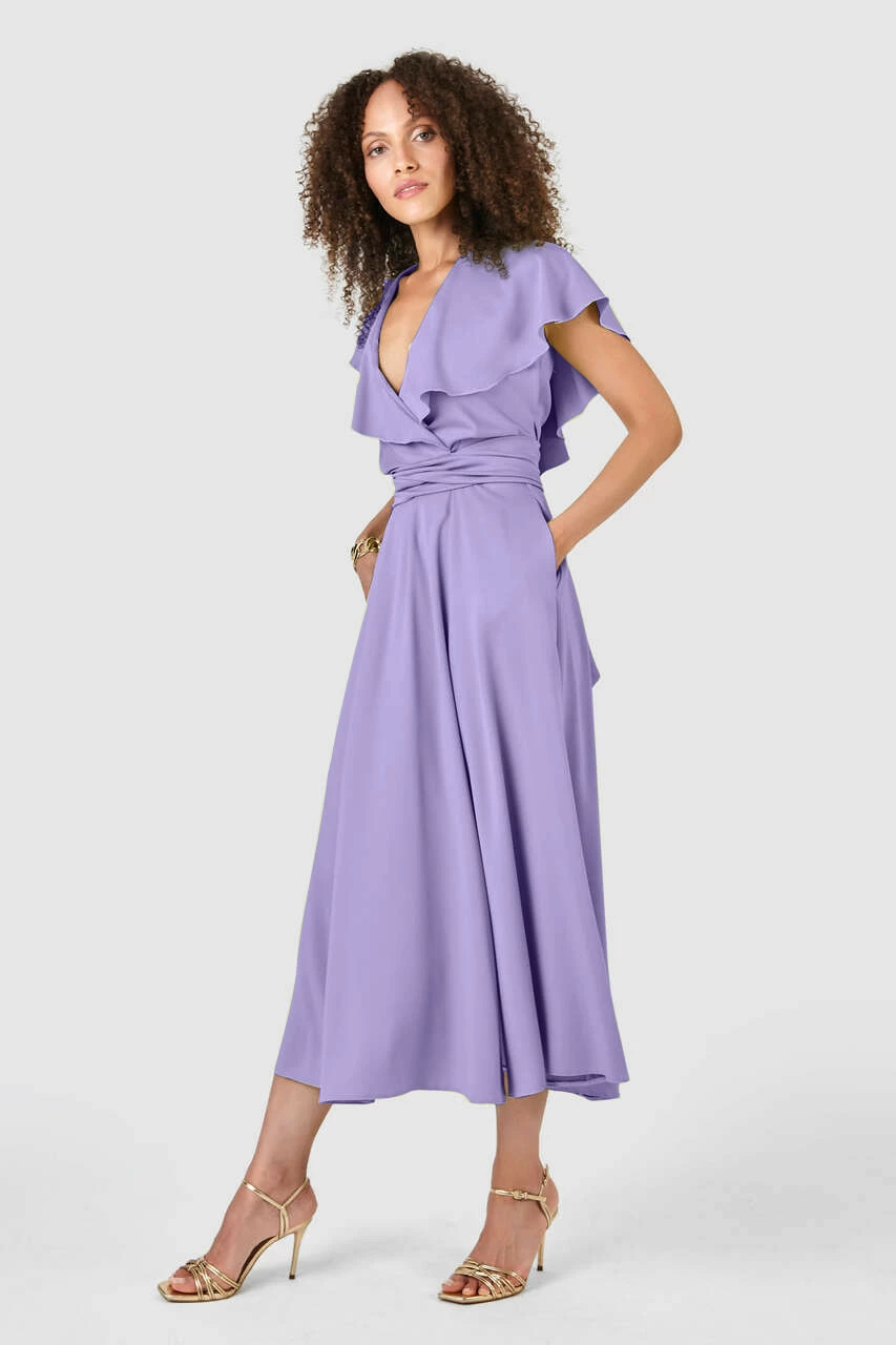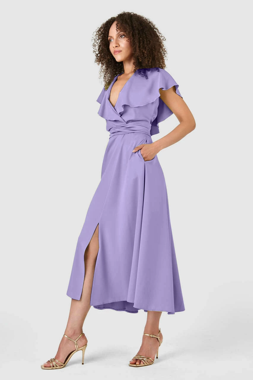 Details: Tie back waist, Side pockets, Front cut slit, Frill sleeves, A – line silhouette