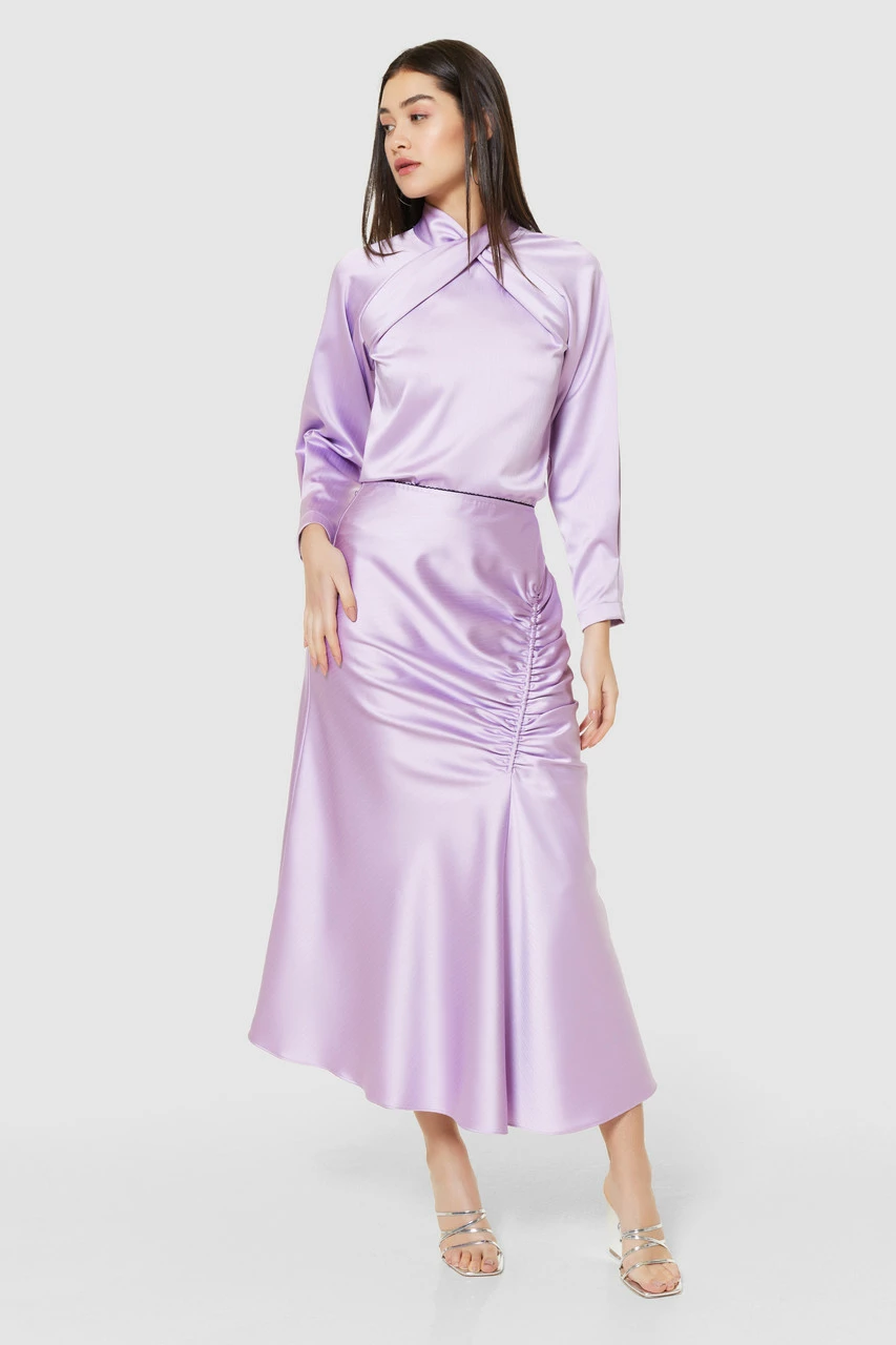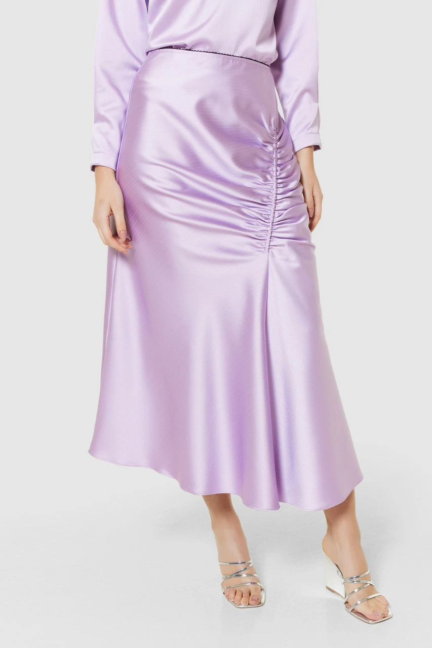 A bias-cut midi skirt in lilac satin with asymmetric ruching that drapes elegantly at the hem For more casual wear, pair it with a chunky knit and knee-high boots for a look we are loving.