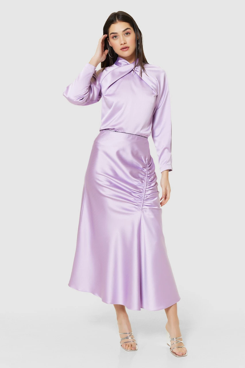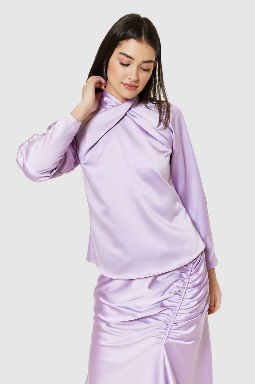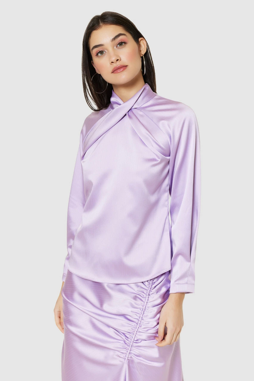 Details: Twisted front, Cuff detailing, Drapes one-sided, Slim sleeves, Skinny collar