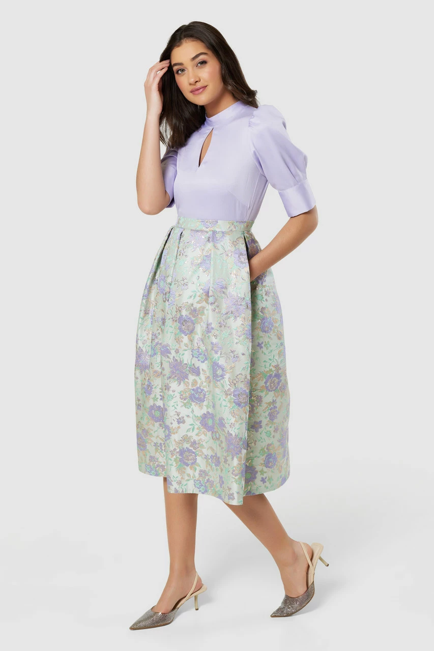 A lilac Satin top with a mandarin collar and keyhole opening compliments the pretty floral jacquard skirt on this Closet Gold 2-in-1 Dress
