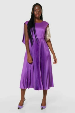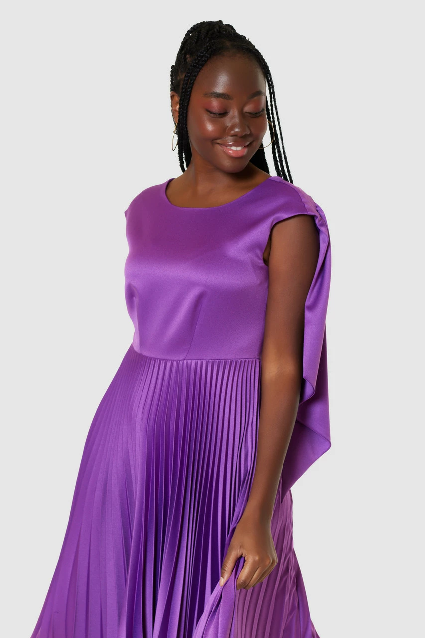 Our iconic pleated dress in deep purple matt Satin that gives a bold and eye-catching look. The standout feature of this dress is the cape detail which drapes gracefully from the shoulders and adds a touch of elegance and sophistication. Dress it up with heels for a special occasion