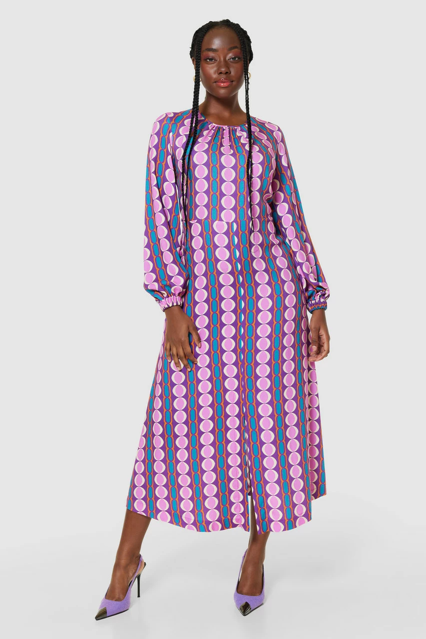 Details: Midi, A-Line, Puff Sleeve, Elasticated cuffs, Gathers on neck, Front cut split