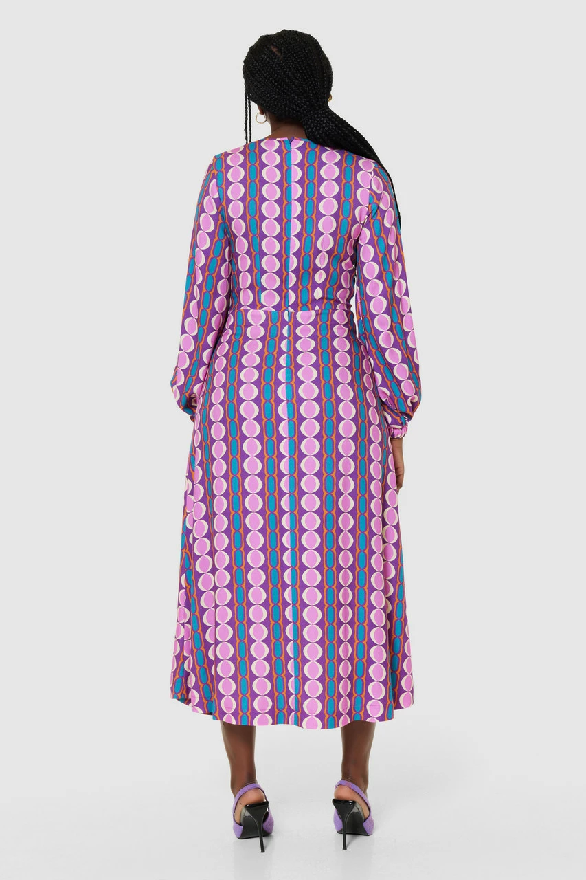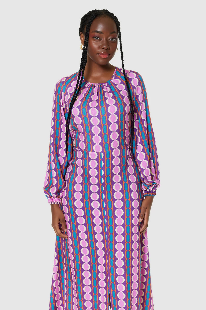 The bold geometric print elevates the overall look of this dress, making it perfect for a statement-making outfit, whether worn to a special event or paired with sneakers for a casual look. It has a round neck with gathers and full puff sleeves. The A-line cut creates a flattering silhouette, draping beautifully over the body.