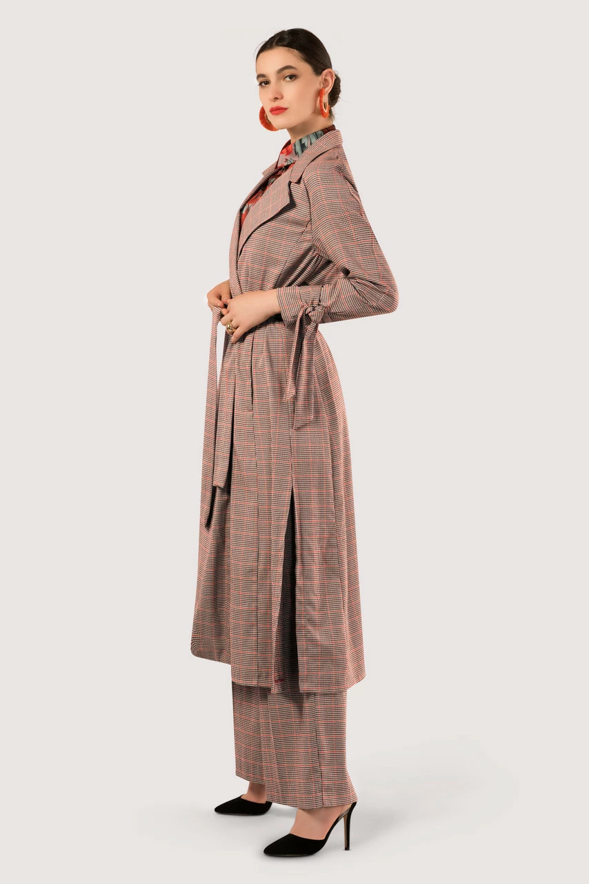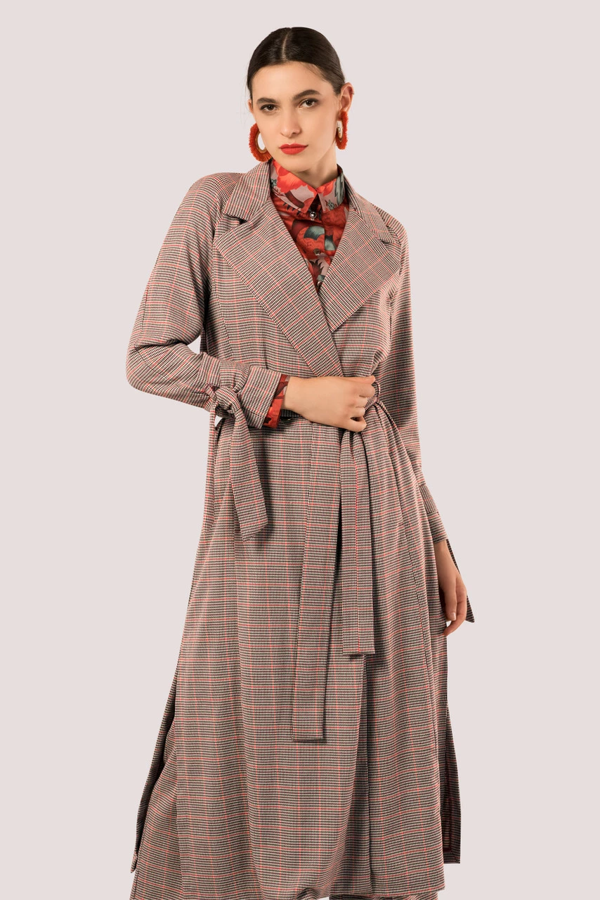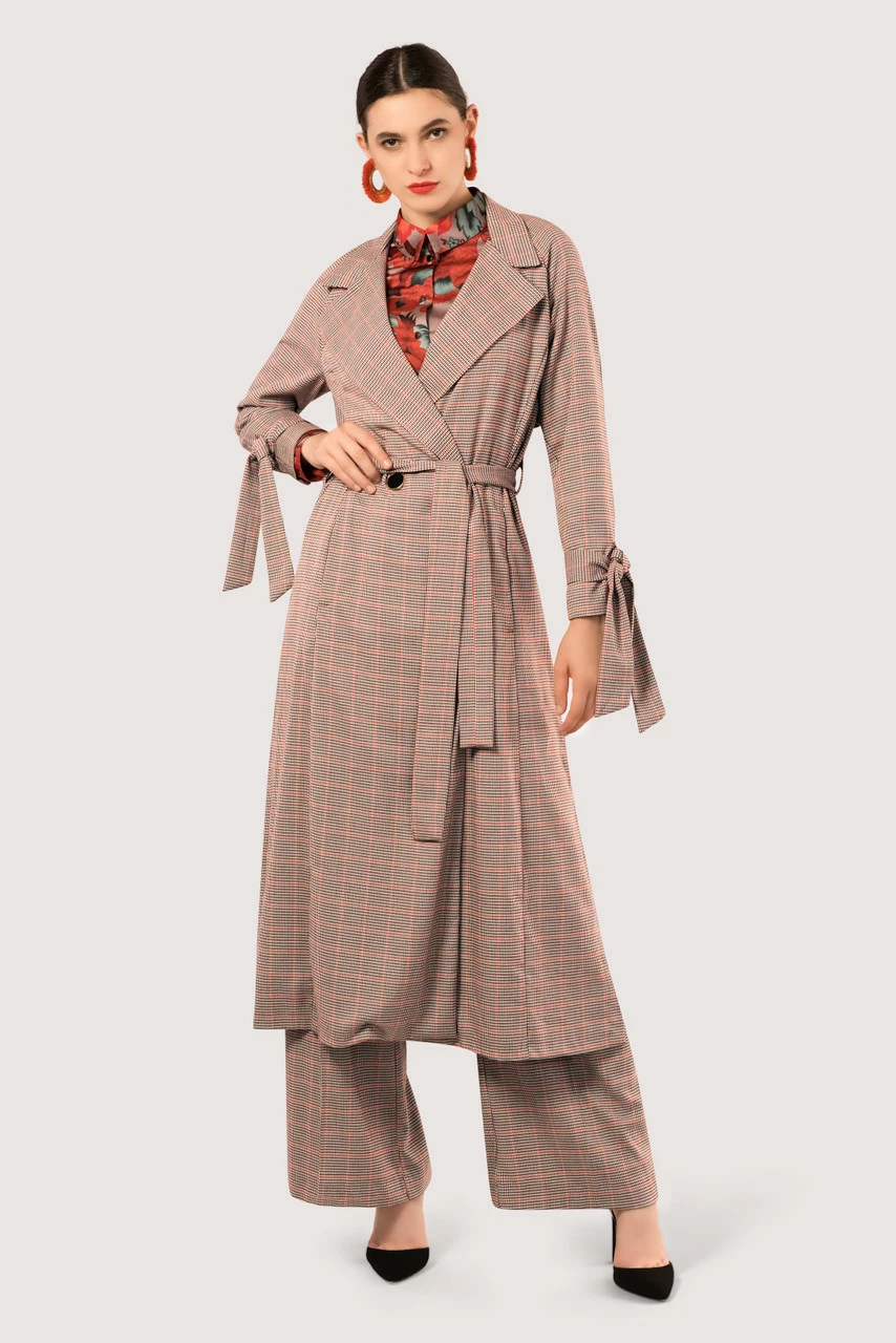 This soft check trench coat hits below the knee to layer over any outfit. Tied at the waist and fastened with accent buttons, this will be your new favourite autumnal trench coat. We even added ties to the cuffs to give you the ultimate feminine coat.