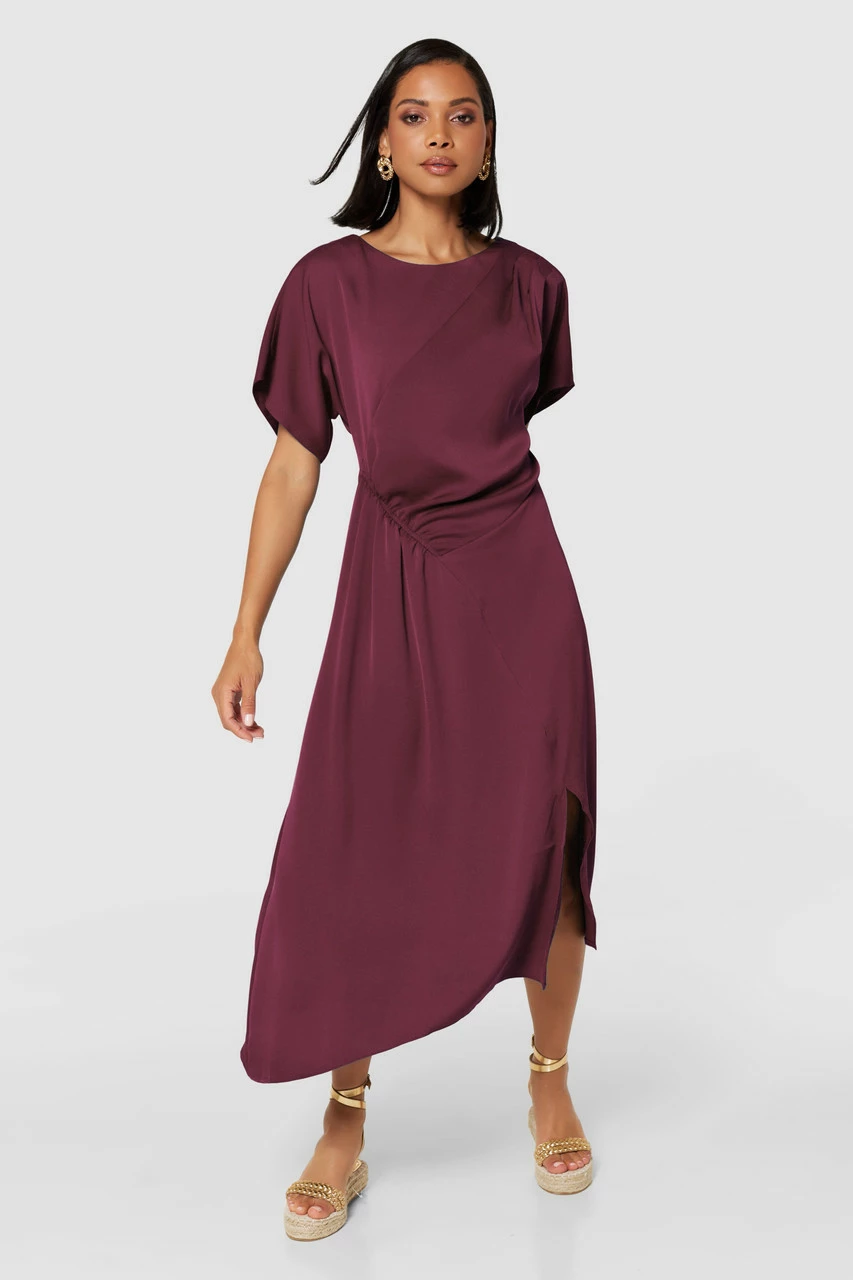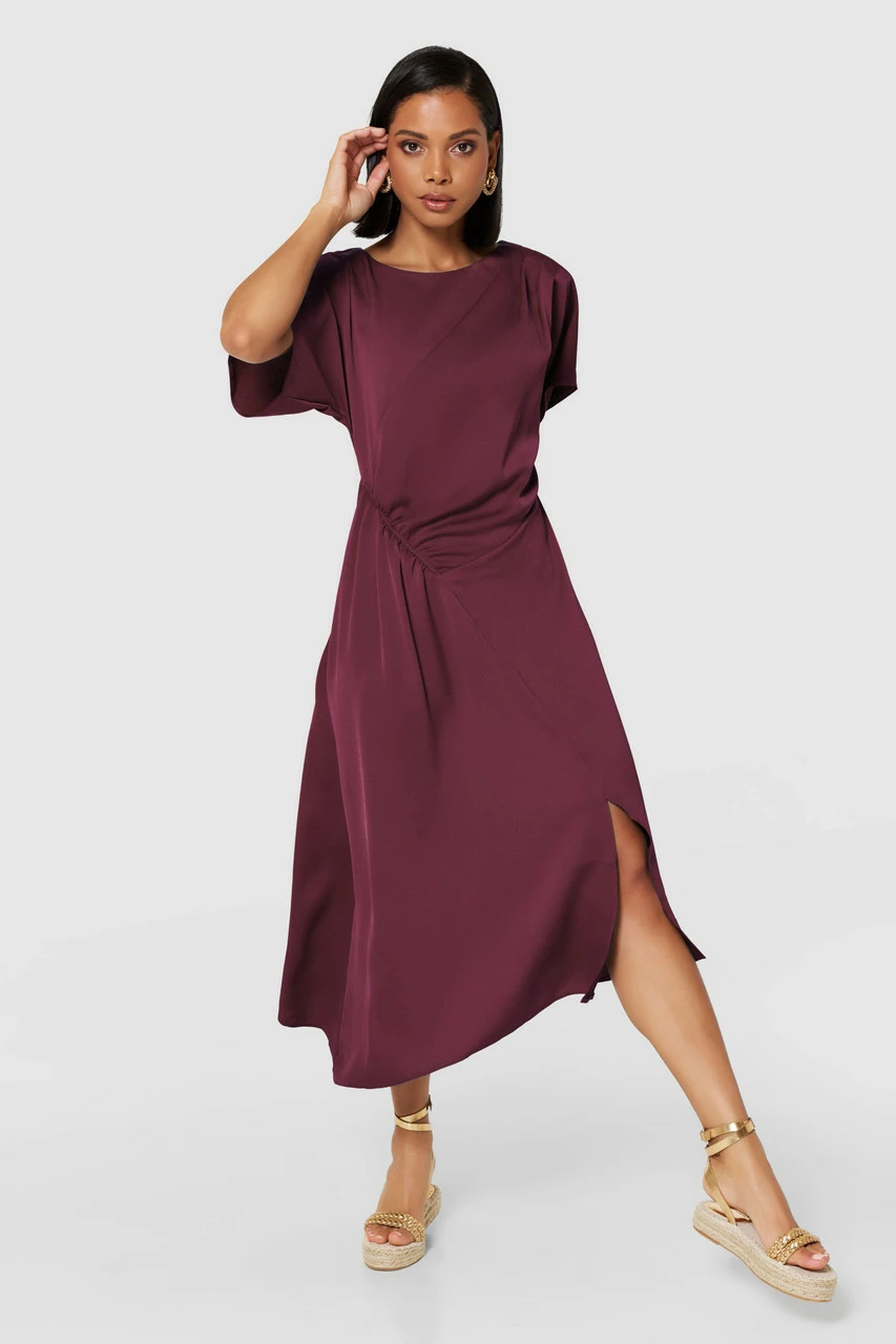 Details: Maxi, Kimono sleeves, Gathers on waist, Fitted waist, Side cut slit, A-line silhouette, Side cinch