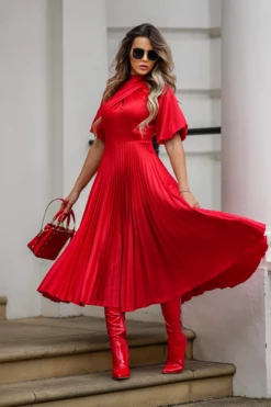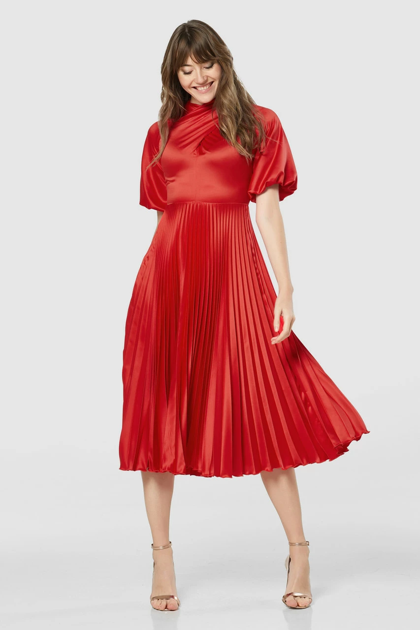 A stunning red, below the knee pleated dress with puff sleeves and wrapped neck.