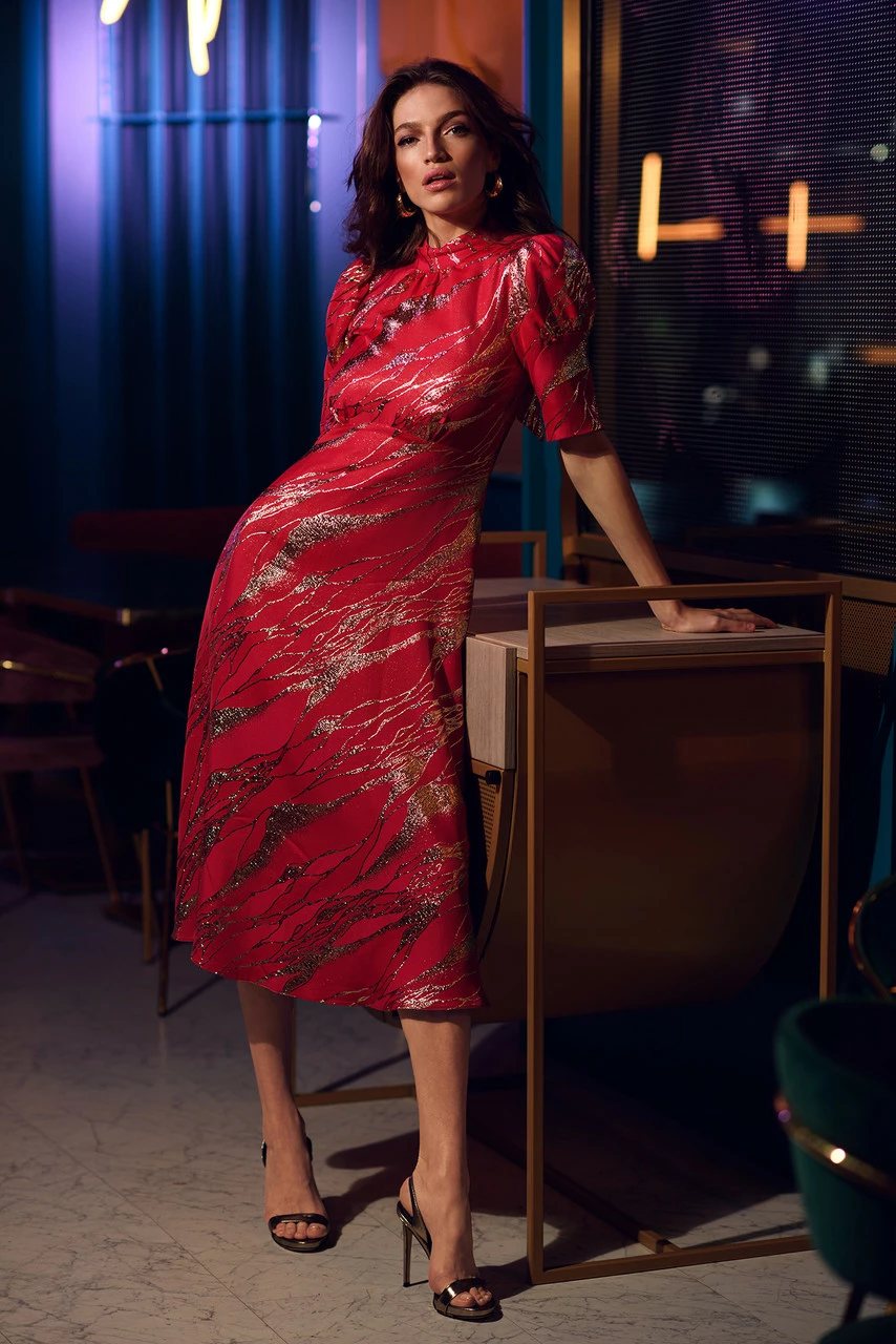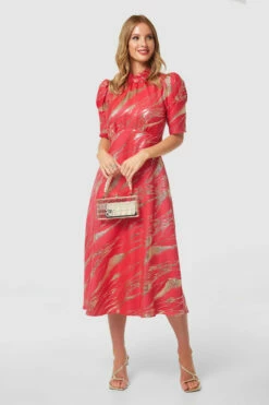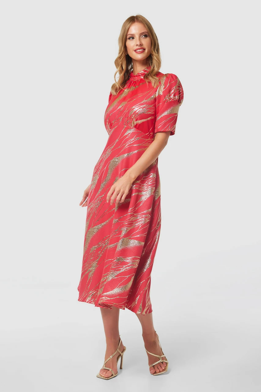 We have put a luxurious spin on one of our bestselling dresses by making it in a luscious Viscose satin Jacquard with a striking gold design woven into the fabric.