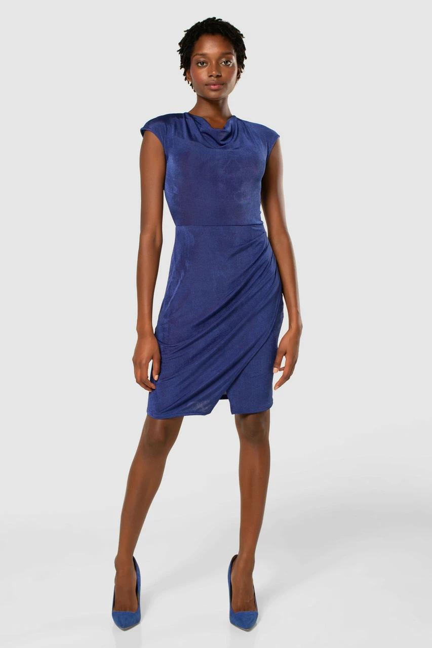 Details: Drape detail, Pencil silhouette, Cap sleeves